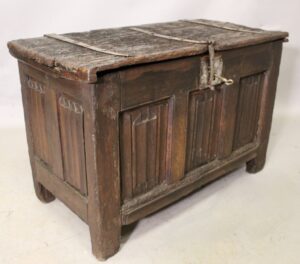 Coffre en chêne sculpté en façade et sur les cotés latéraux de 7 panneaux en décor à plis de ...