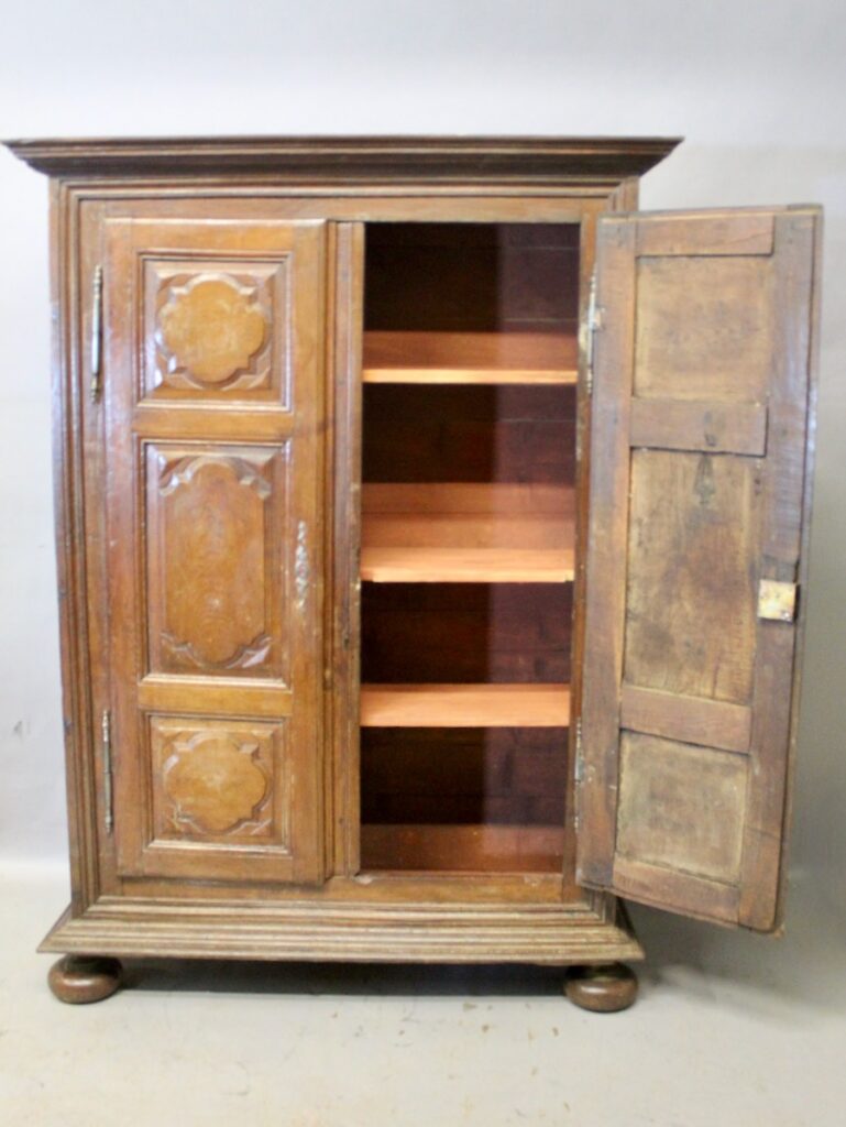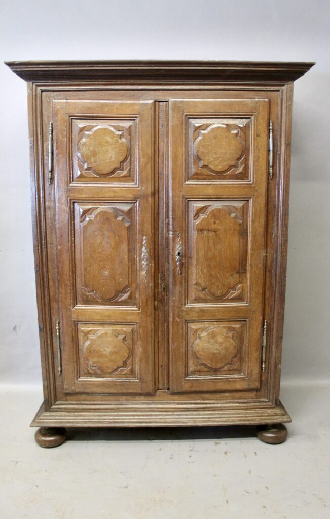 Petit modèle d'armoire LOUIS XIII en chêne, reposant sur deux pieds raves à l'avant et deux pieds droits à l'arrière.
