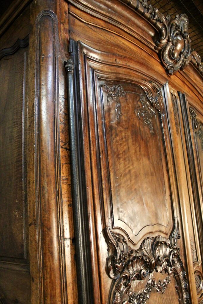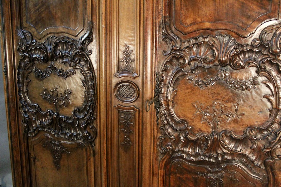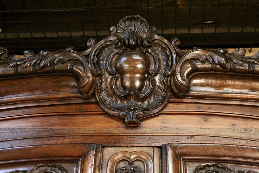 Elle ouvre par deux portes à cadre mouluré finement travaillées en fort relief à motif floral et feuilles d'acanthe.