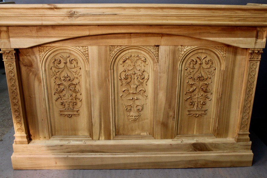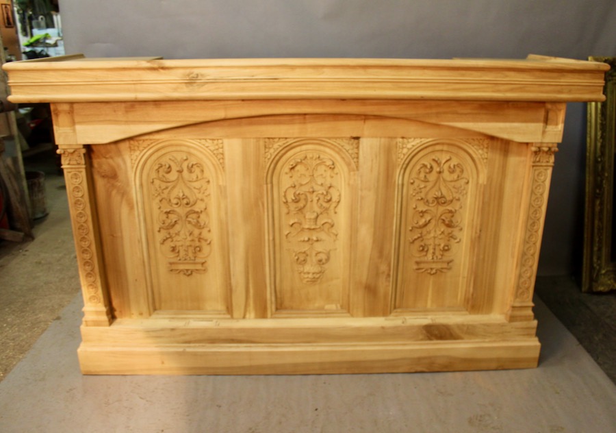 Bar ou comptoir en chêne et noyer , tout aménagé, portes verres, frigo, et porte bouteilles, à façade ancienne richement sculptée.