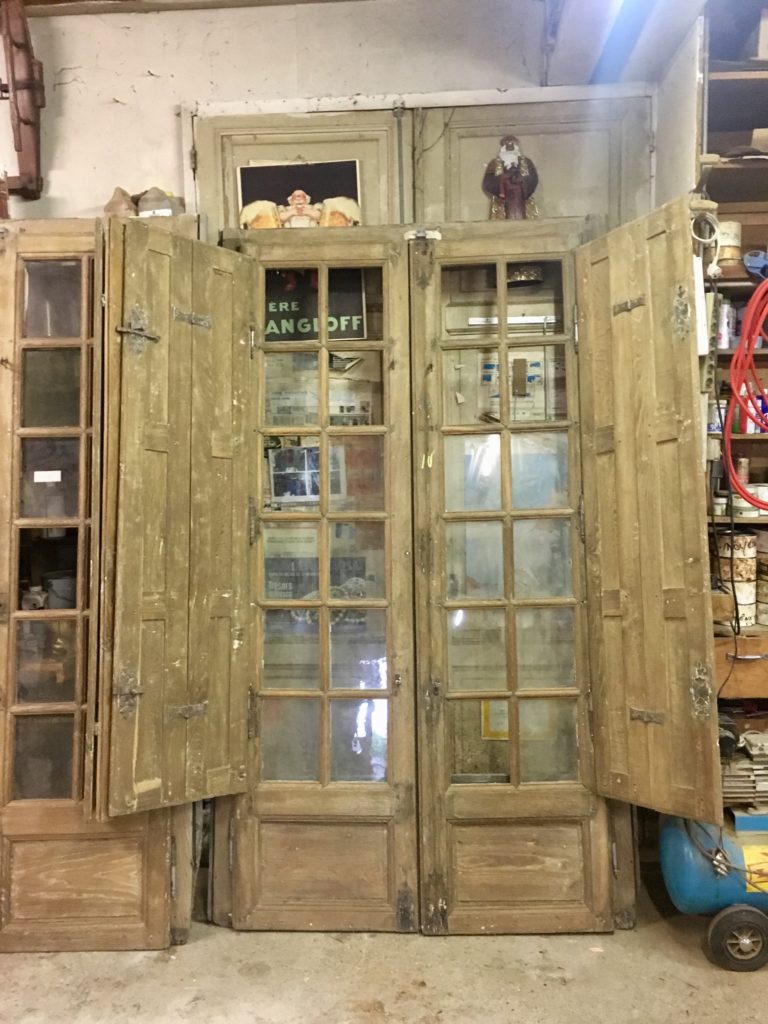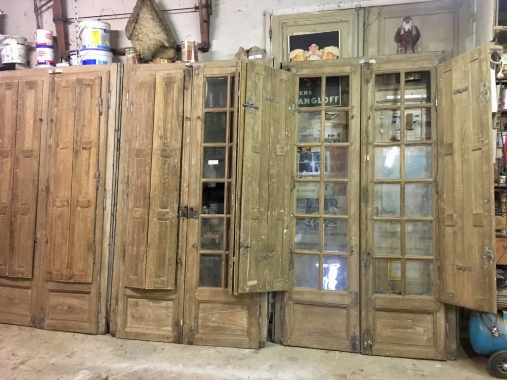 mportante boiserie, façade, constituée de 3 paires de portes à petits carreaux anciens, ouvrant intérieur, avec volets articulés ouvrant intérieur également.