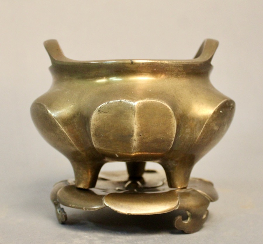 Grand brûle-parfum tripode en bronze à deux anses avec son support.