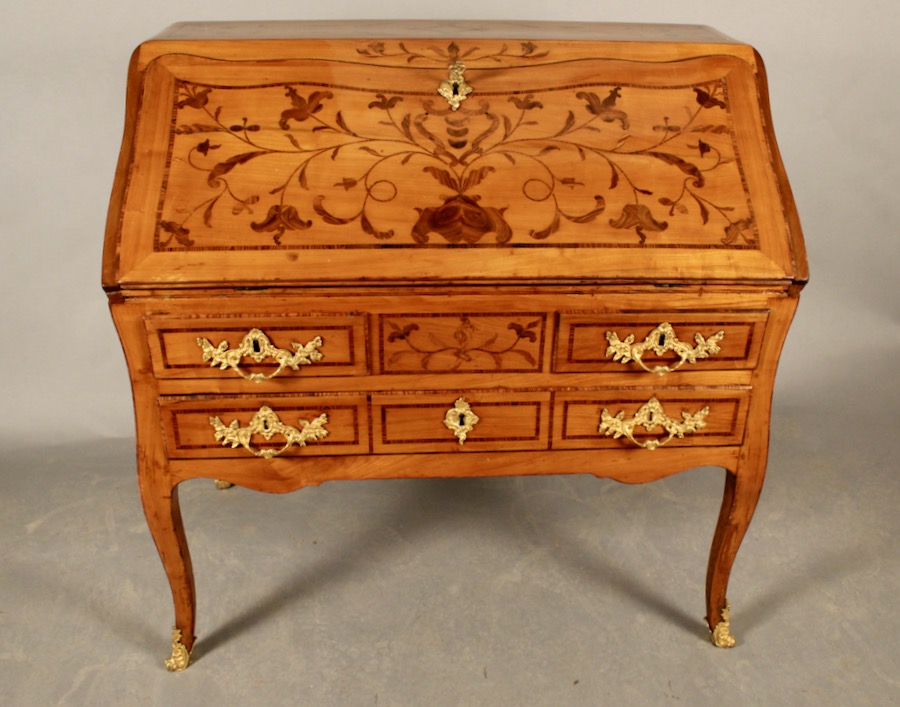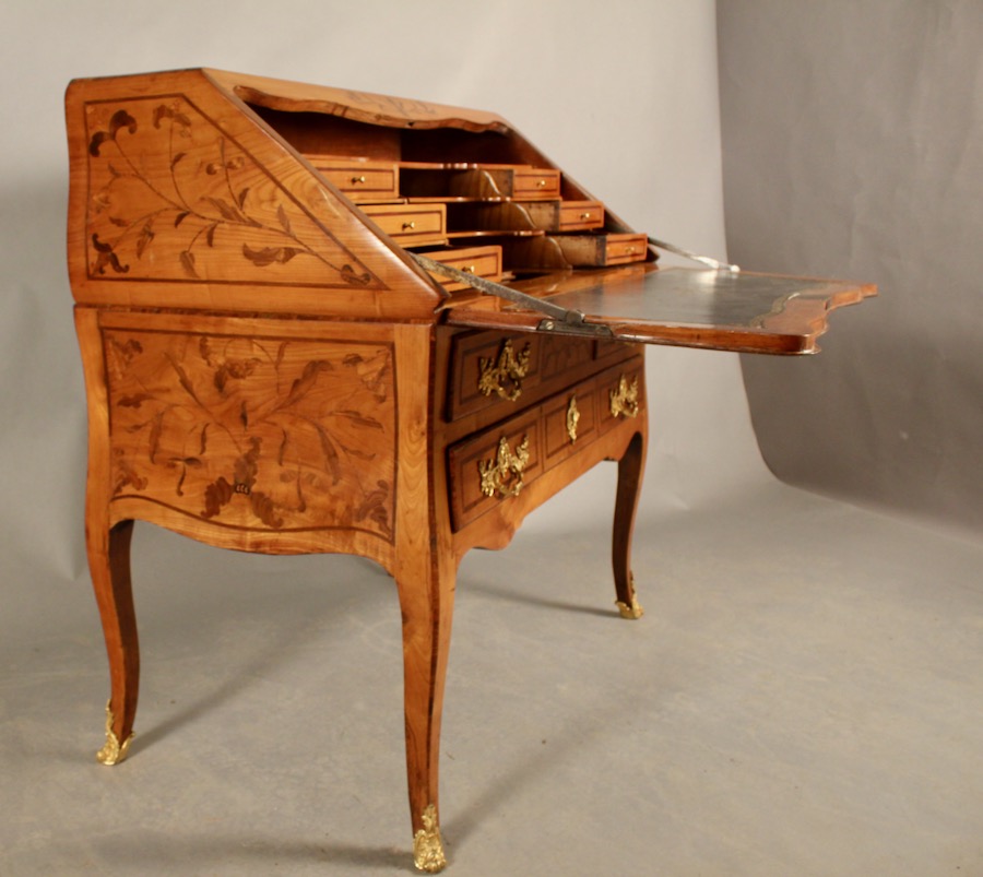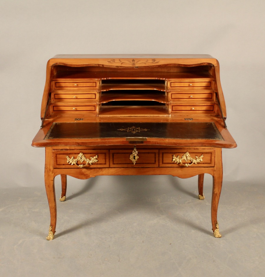 Le bureau est en meriser et en marqueterie de bois de violette, bois de bout.