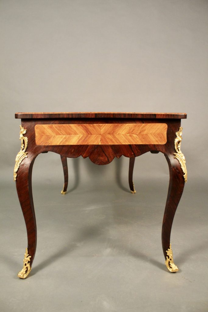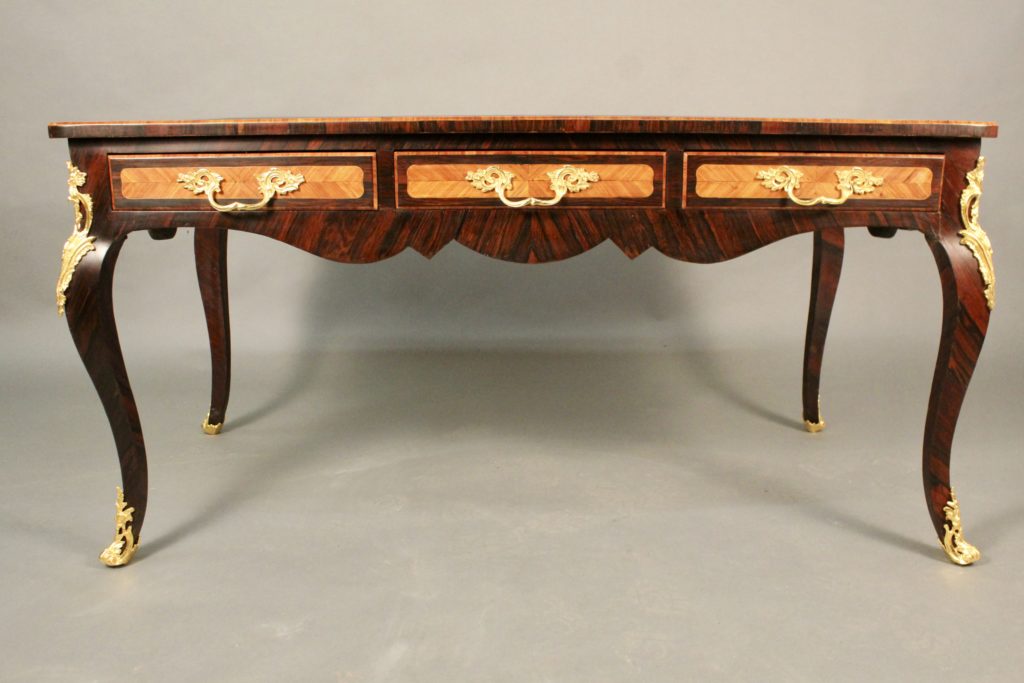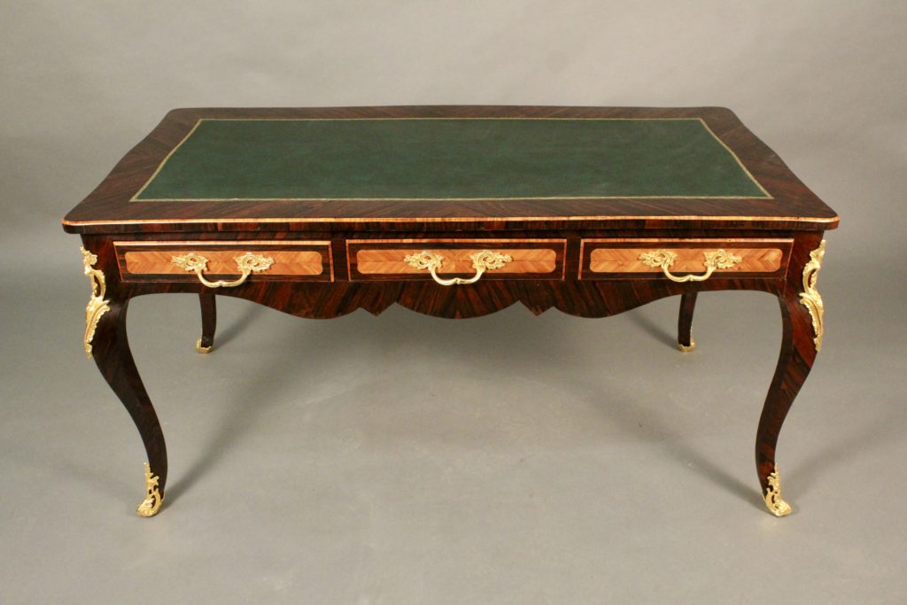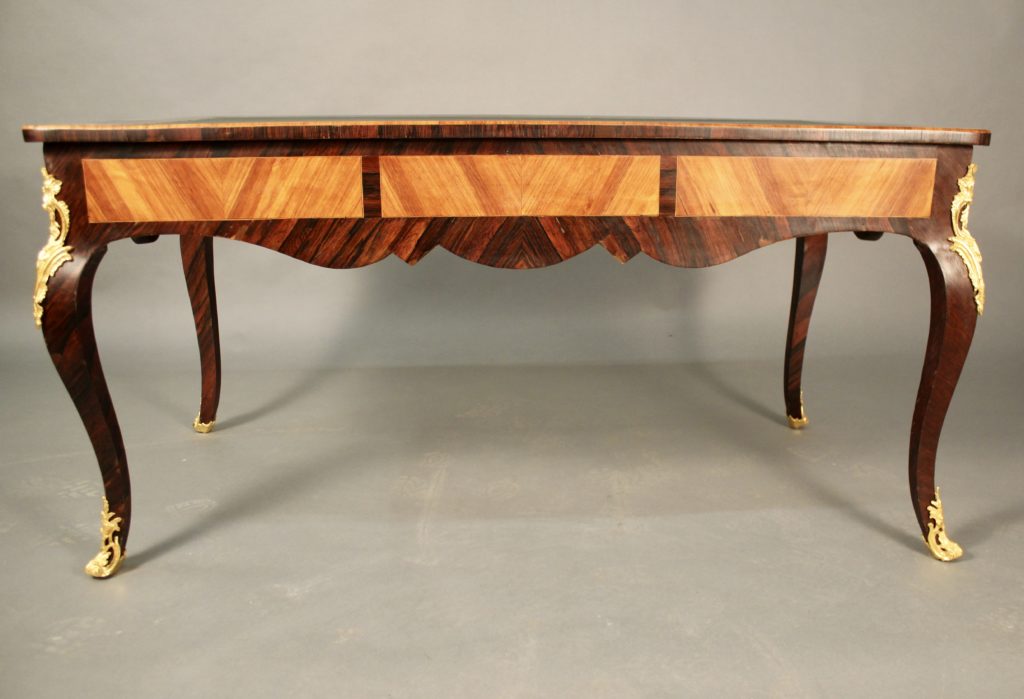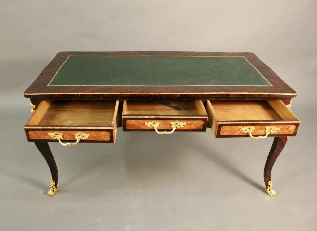Il ouvre par trois tiroirs en façade. Dessus de cuir vert avec frise dorée.