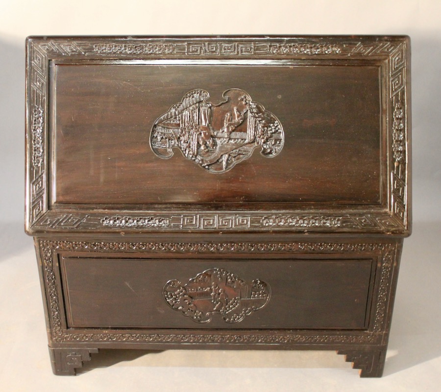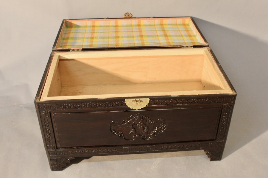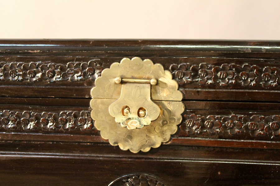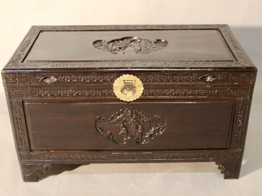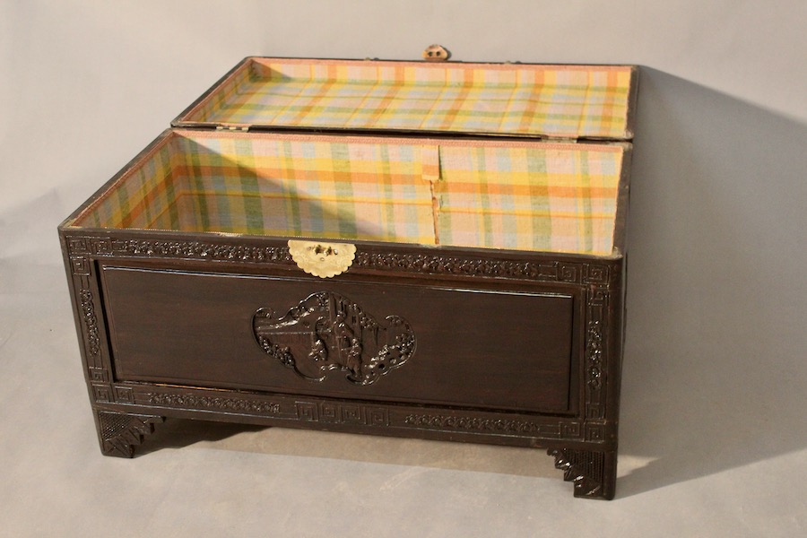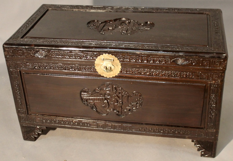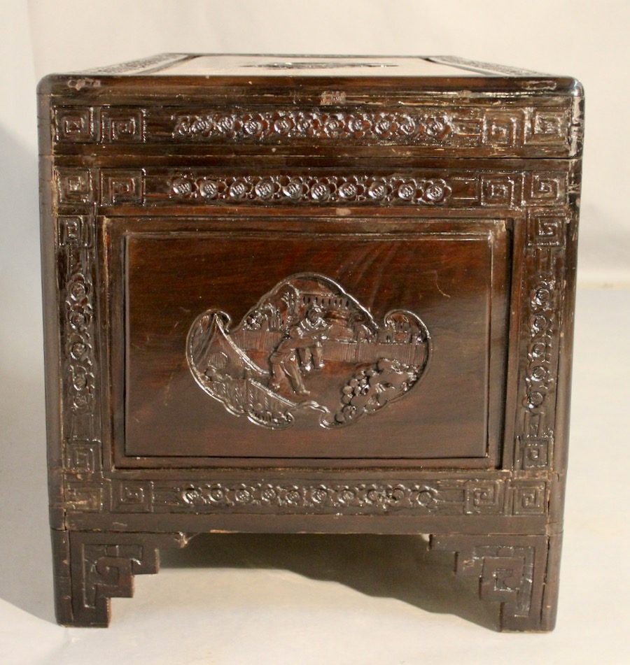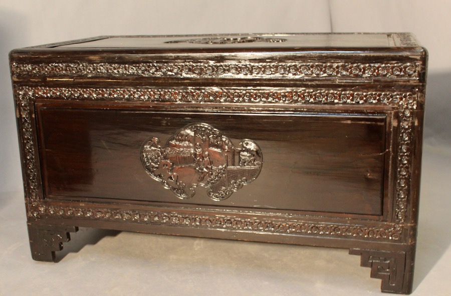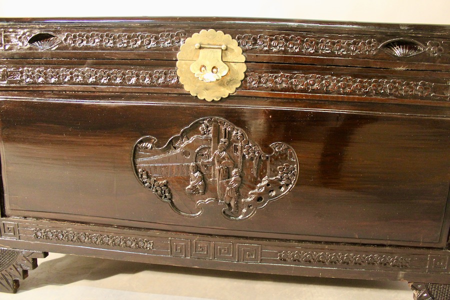 Important coffre de mariage chinois en camphrier, richement scupté de scènes de vie, toutes faces.