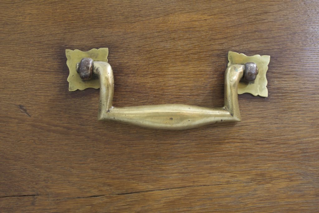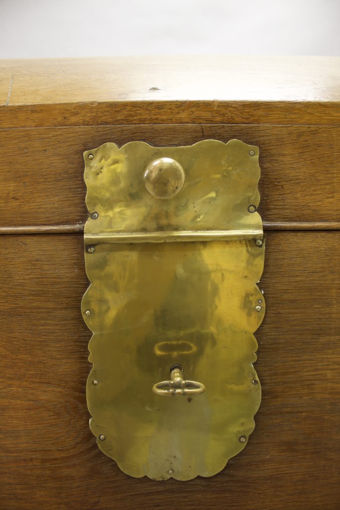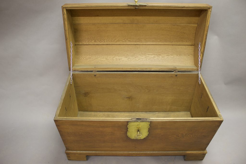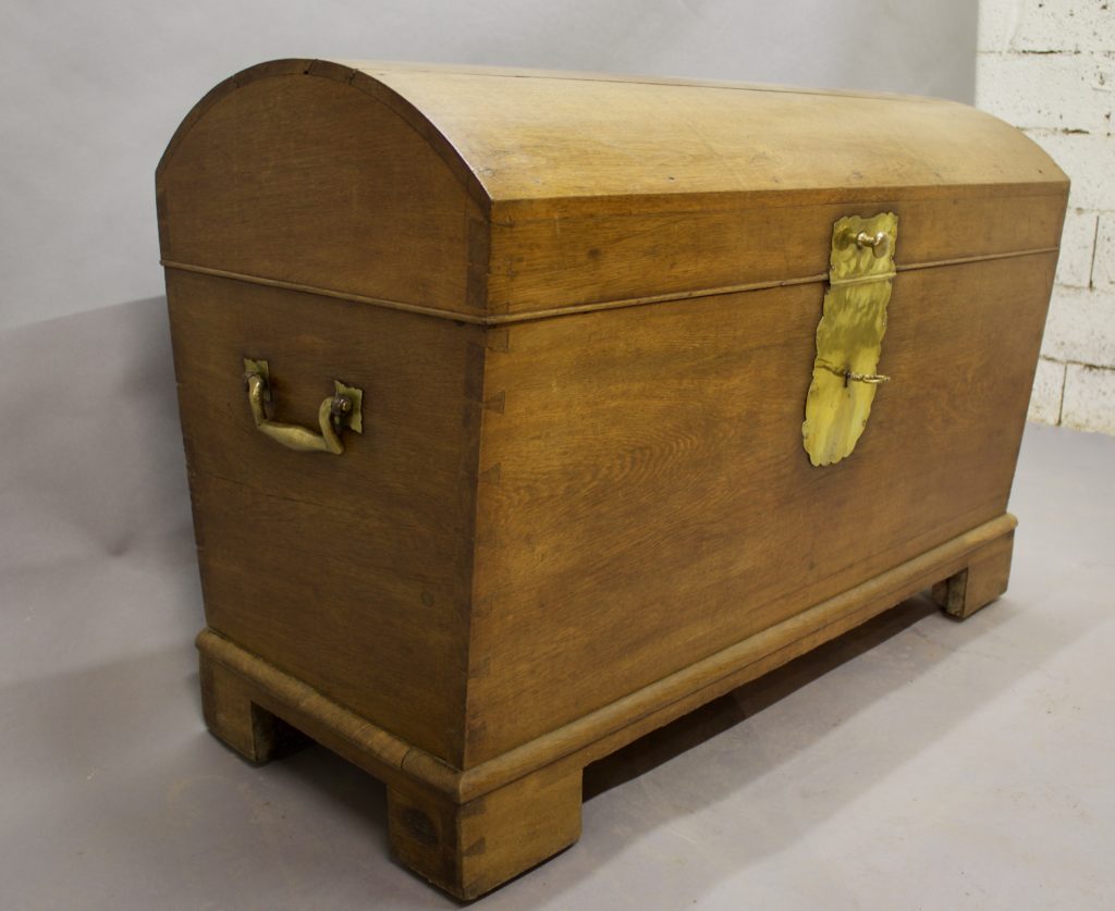 Coffre en chêne à dessus bombé, à roulettes. Montage en queue d'aronde. Il ouvre sur un grand volume. Charnières anciennes. La clef fonctionne. Poignées de prise de chaque coté du coffre.