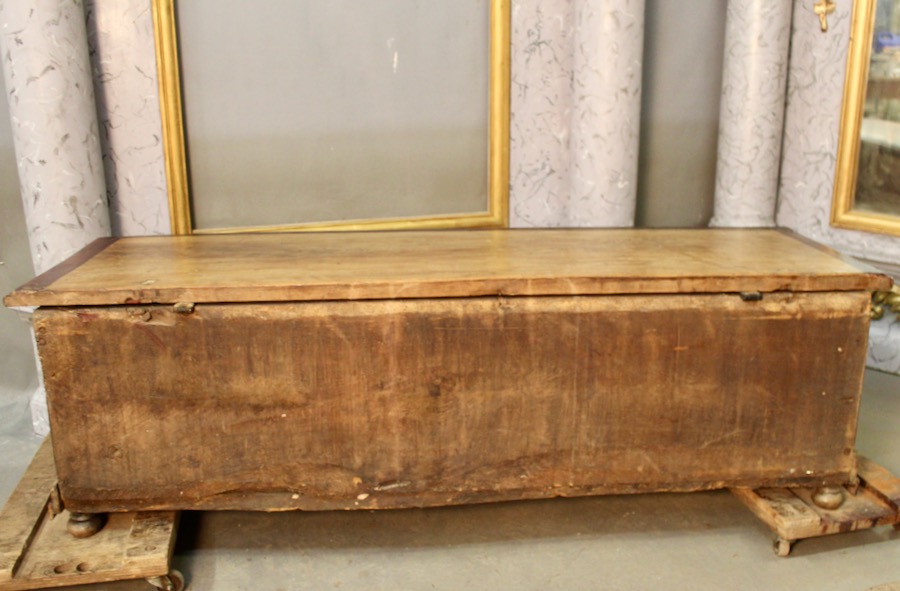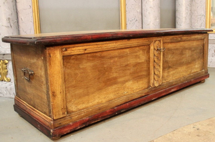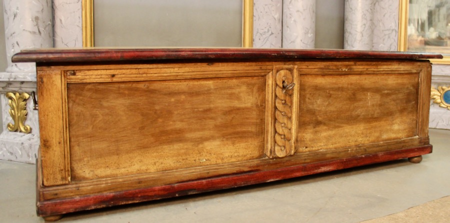 Coffre XIXème en noyer, ouvrant par un grand abatant sur charnières anciennes, et retenu par une chaine.