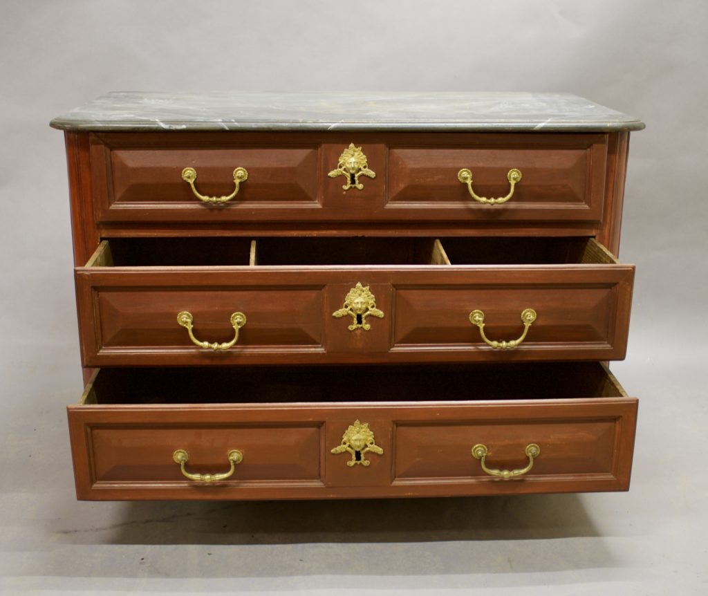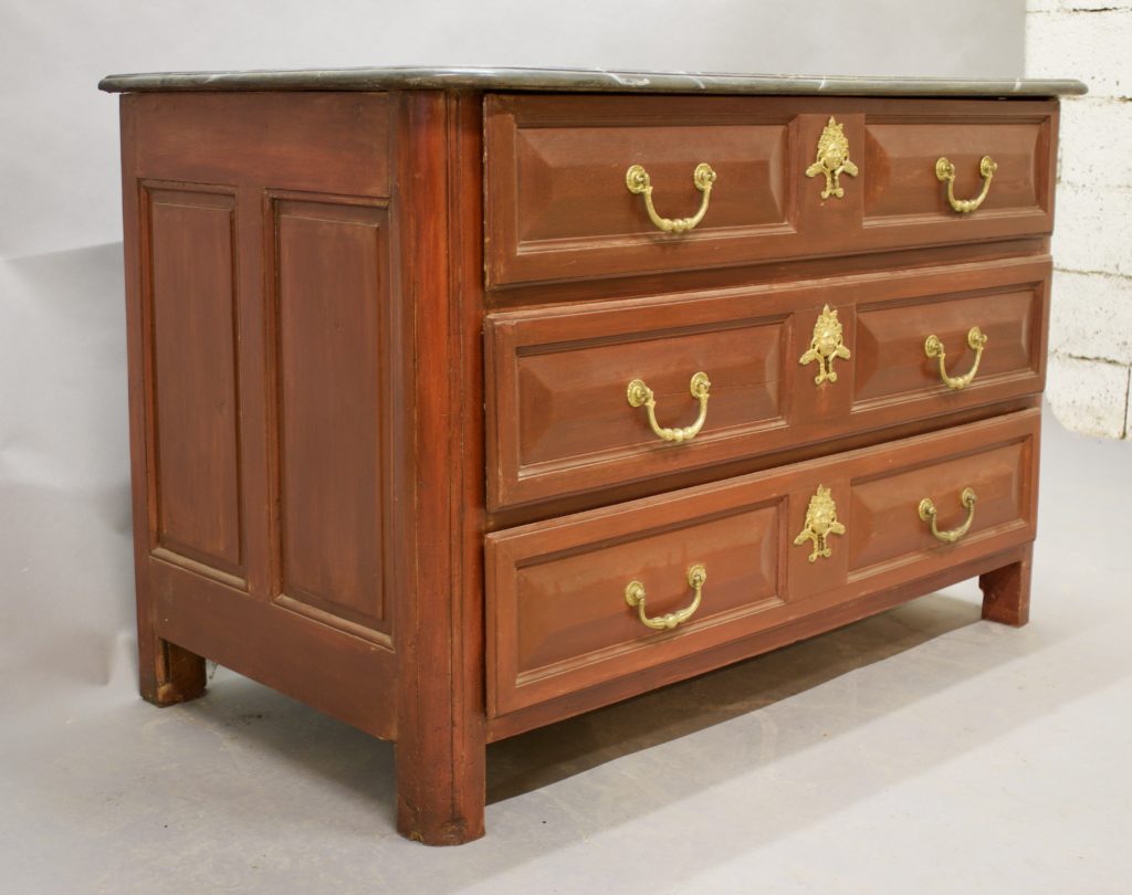Commode d'époque Louis XIV, panneautée sur les cotés, à dessus faux marbre. Elle ouvre par 3 tiroirs à pointe de diamant. Entrées de serrure et poignées en bronze doré.