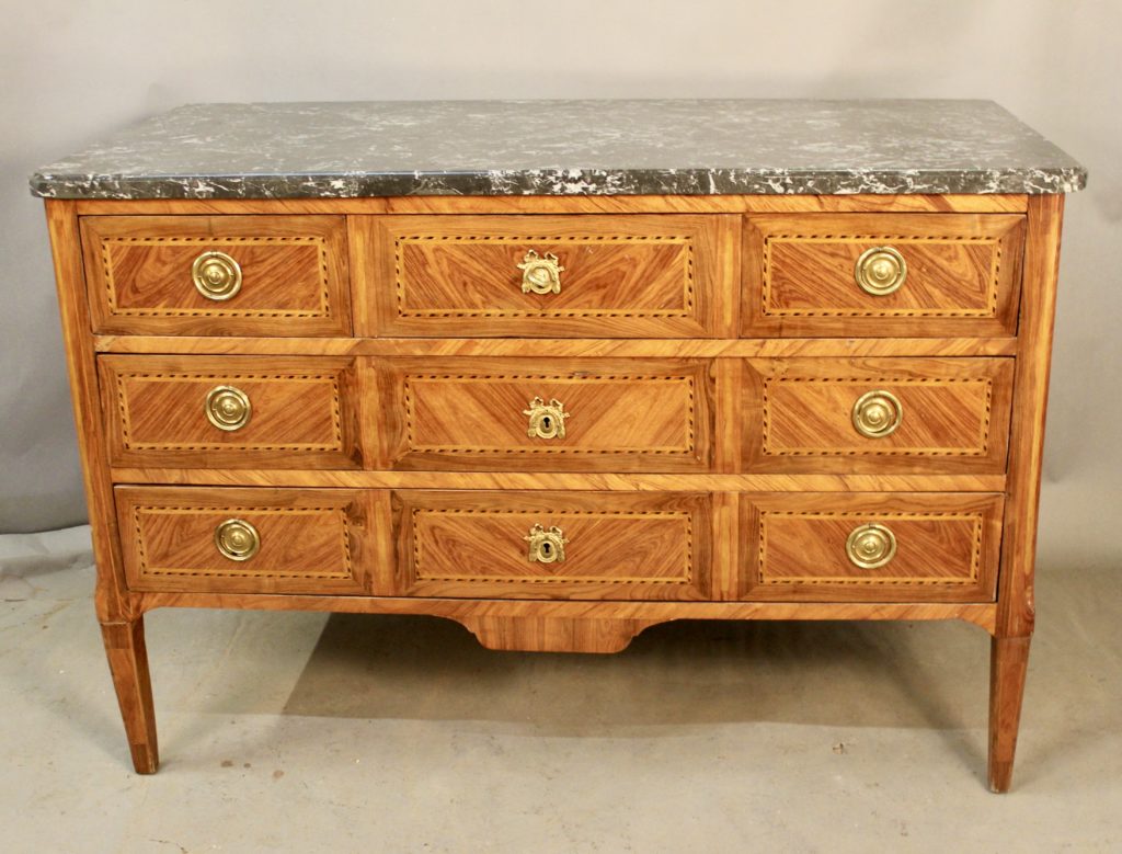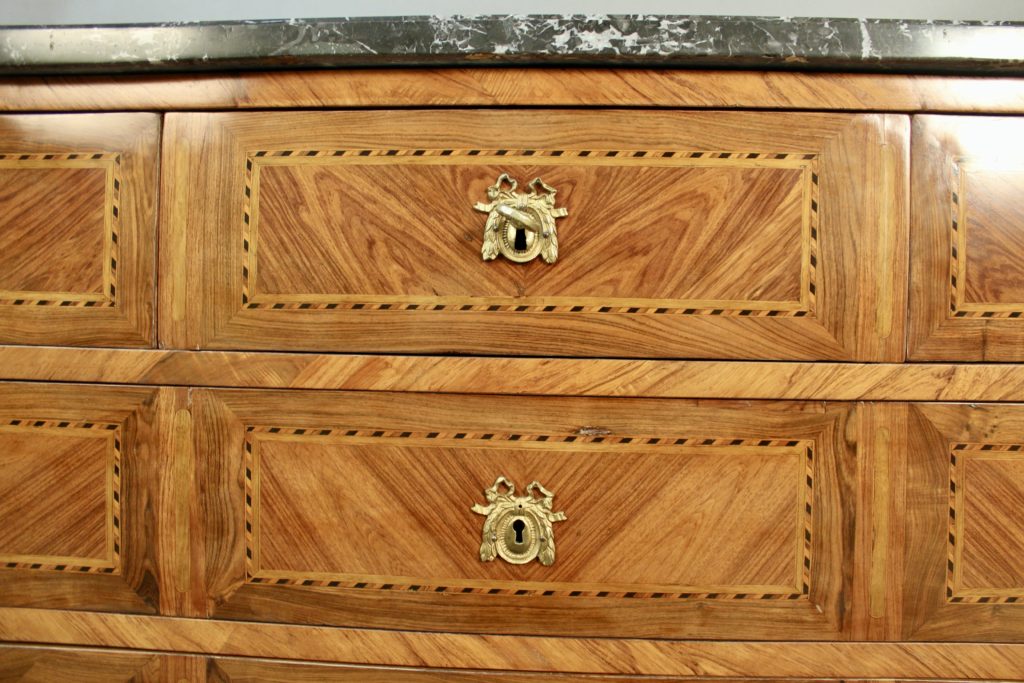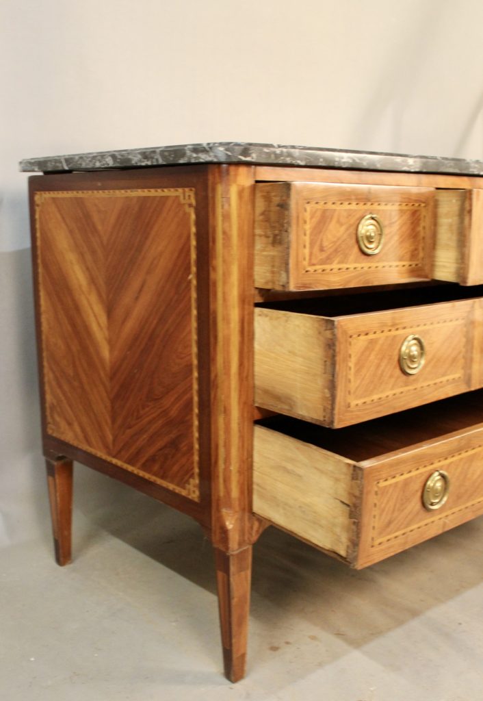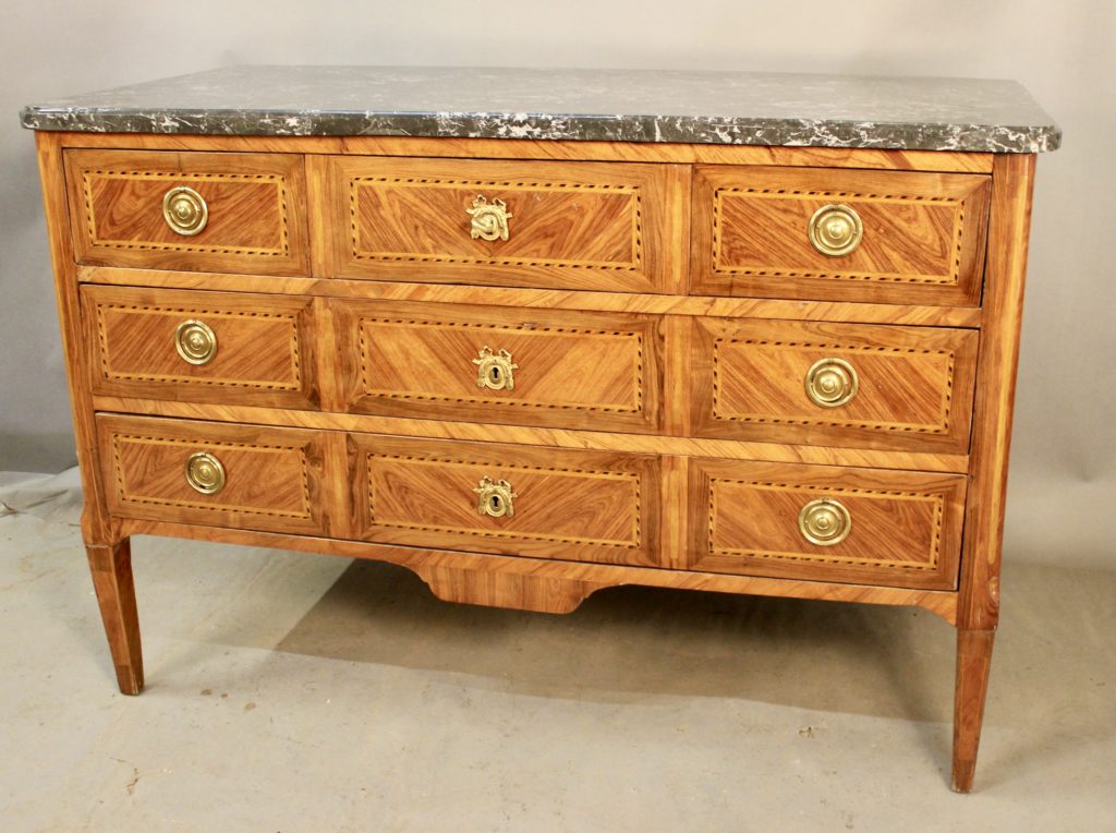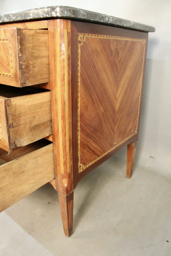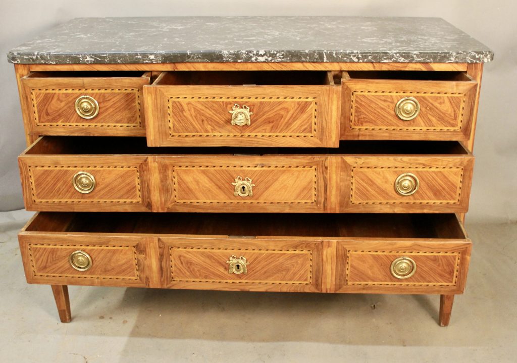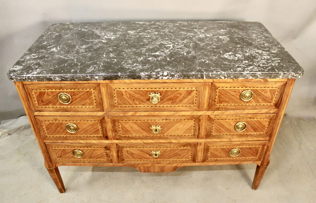Commode époque Louis XVI en marqueterie, ouvrant en façade à cinq tiroirs, dont deux grands et trois à la ceinture,