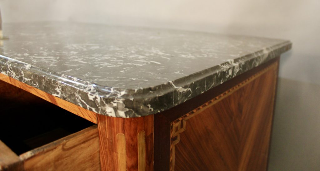 Coiffée d'un marbre brèche gris Saint Anne veiné noir et blanc et mouluré.