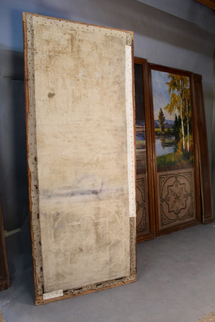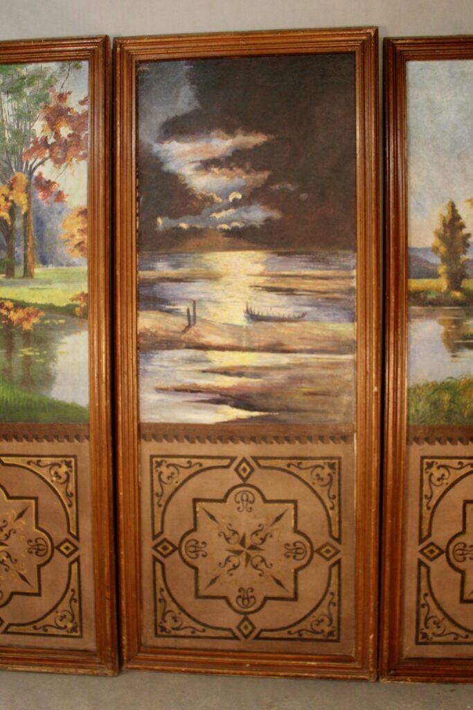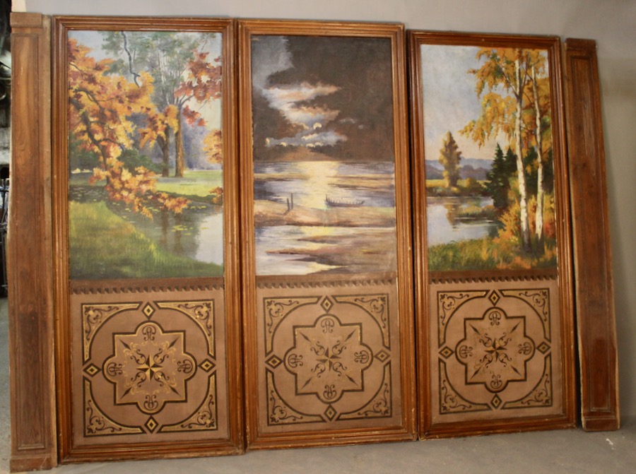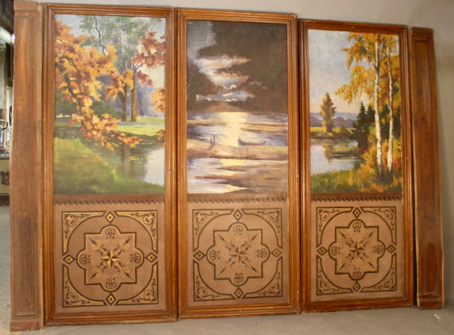 Ensemble de 3 grands panneaux peints à décor de forêt et d’étang XIXème