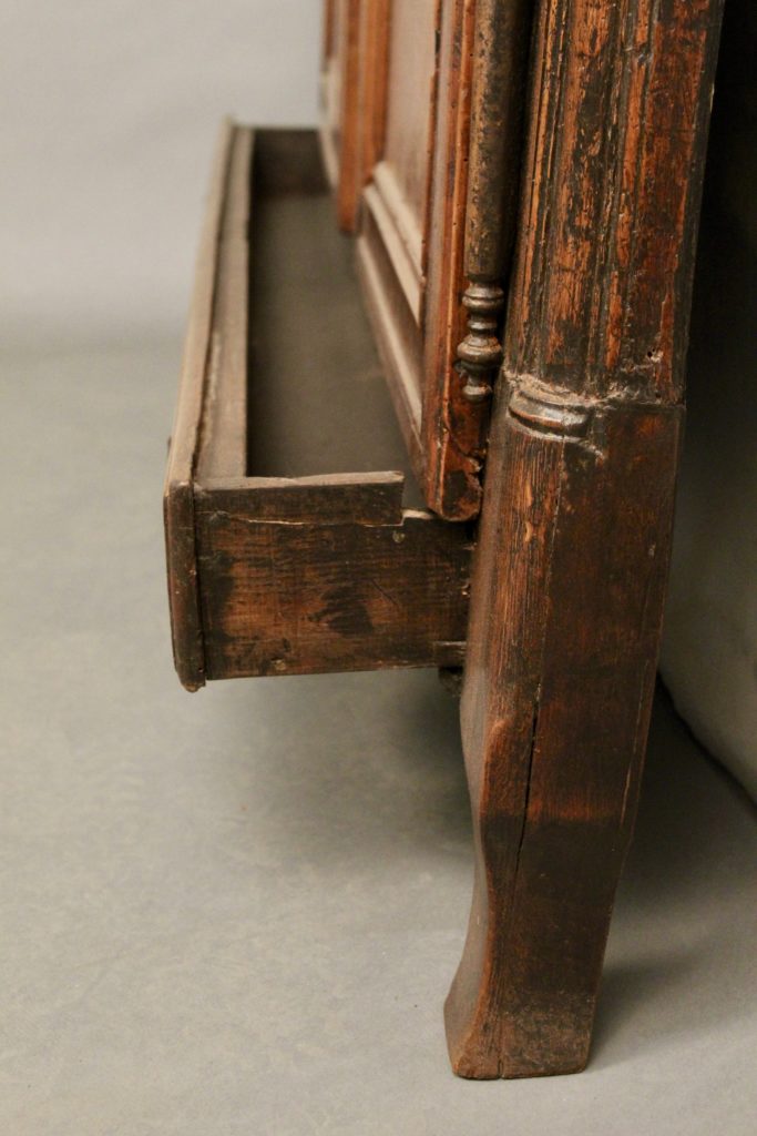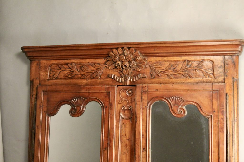 La traverse du haut est richement sculptée d'un bouquet de fleurs et de guirlandes de fleurs.