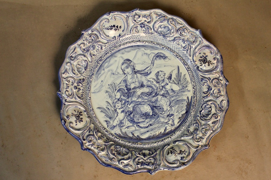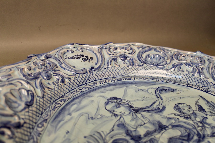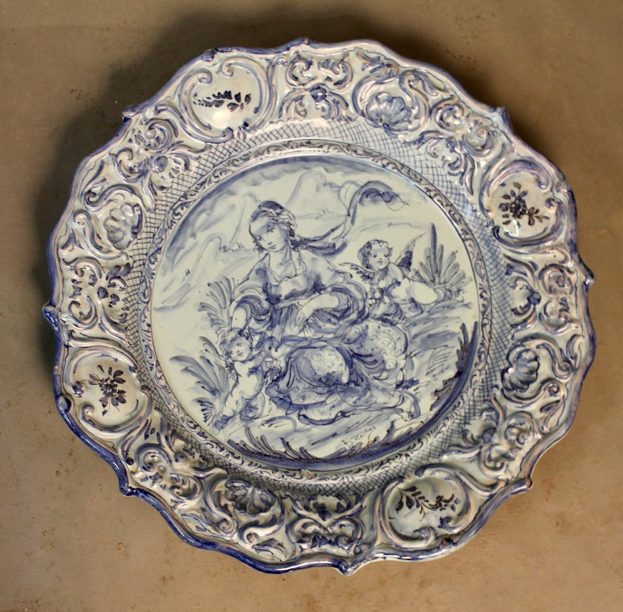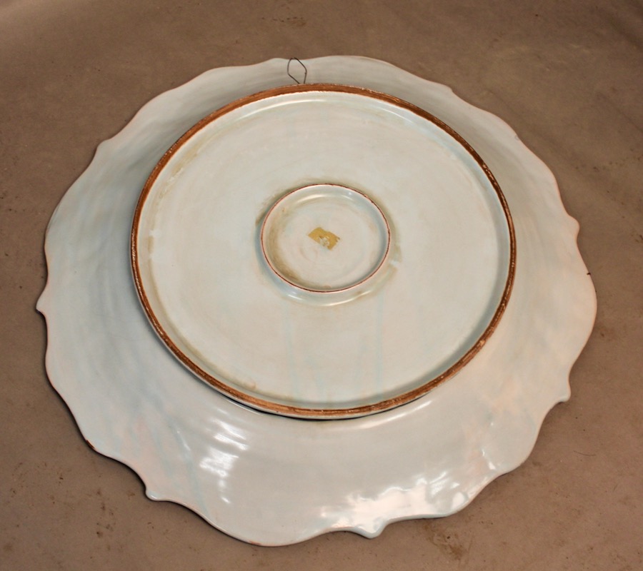 Grand plat creux rond en faïence bleue àbords festonnés.
