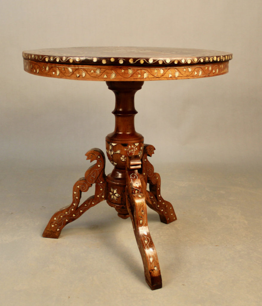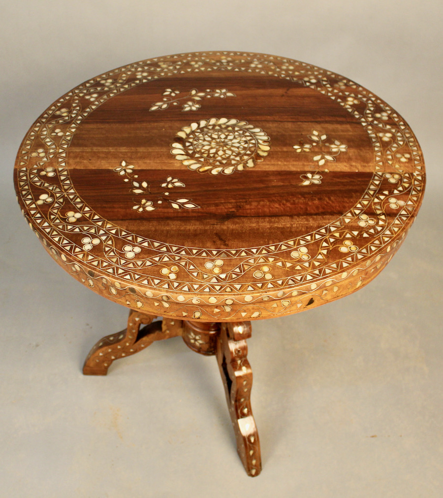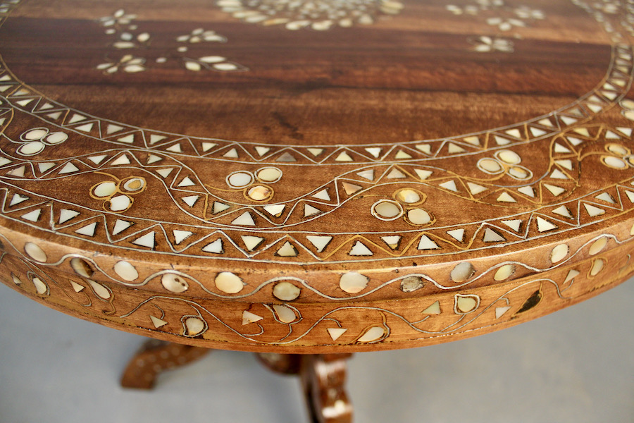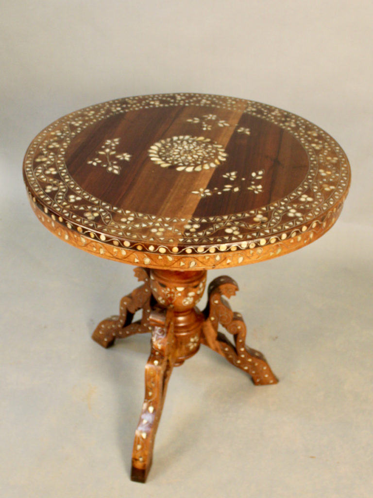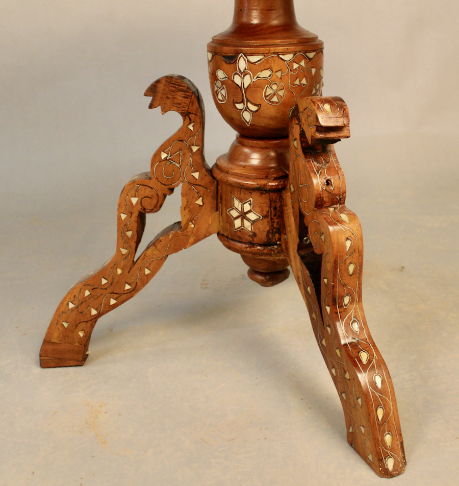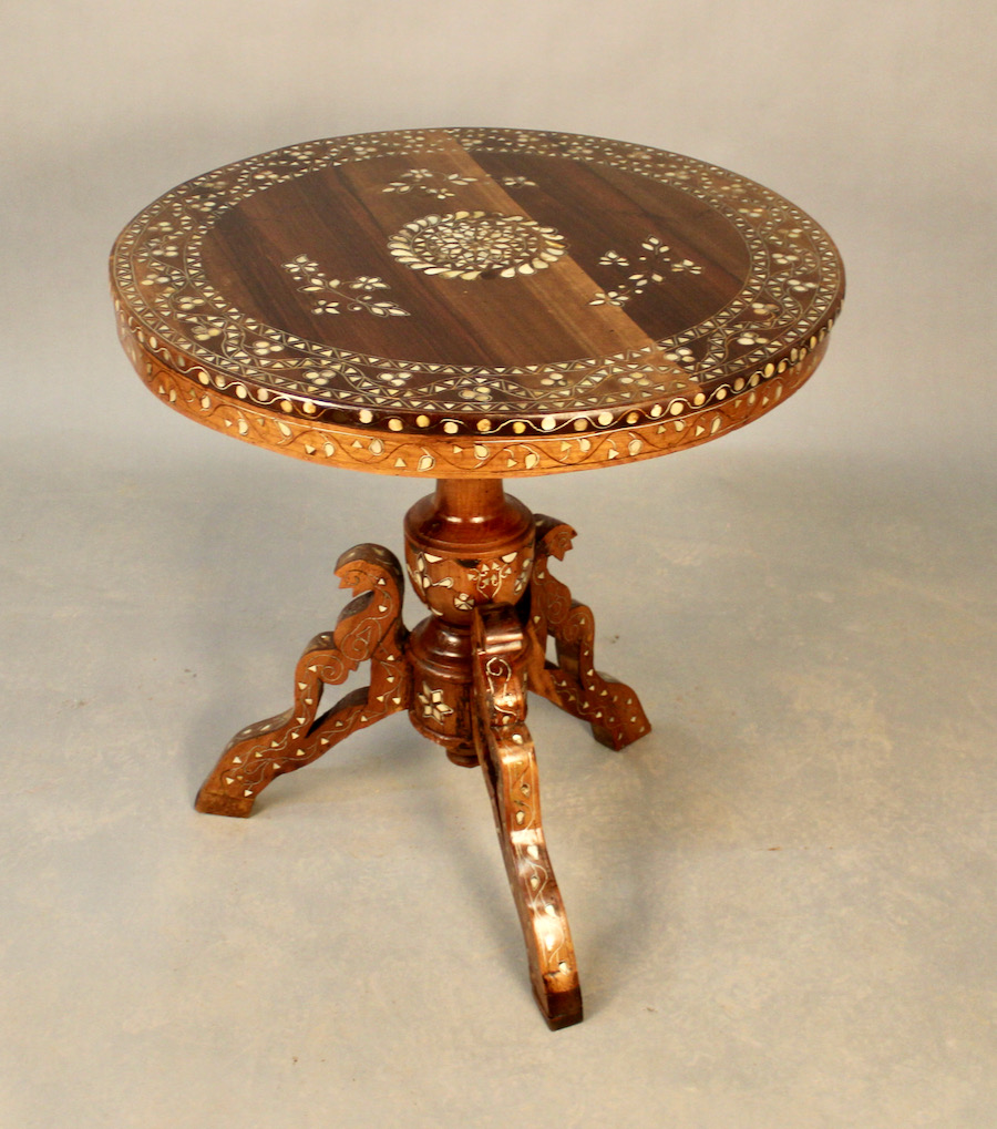 Guéridon à pied central tripode , avec un remarquable travail de marqueterie et d'incrustation de nacre.