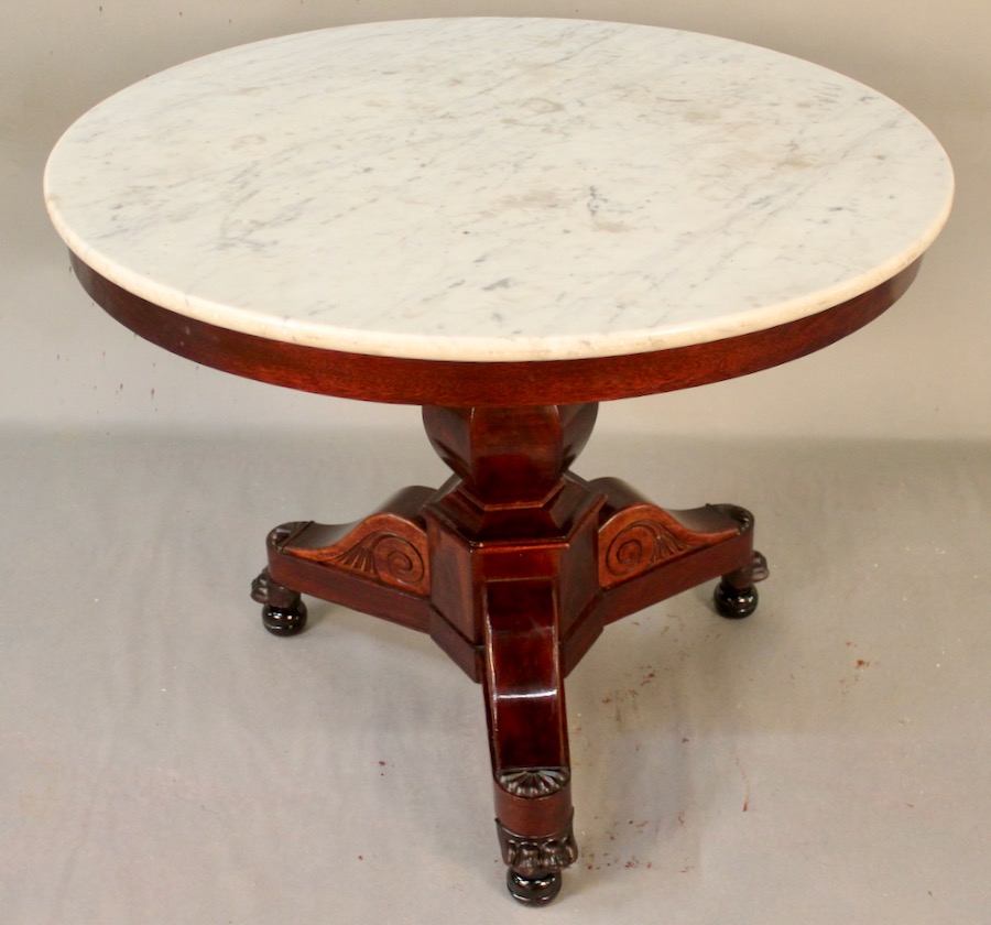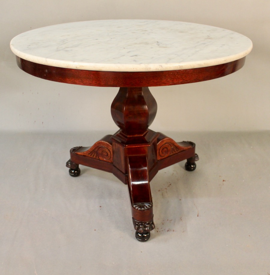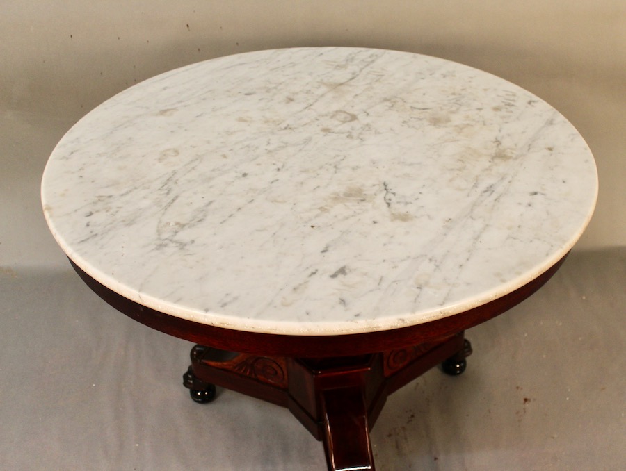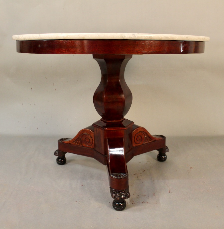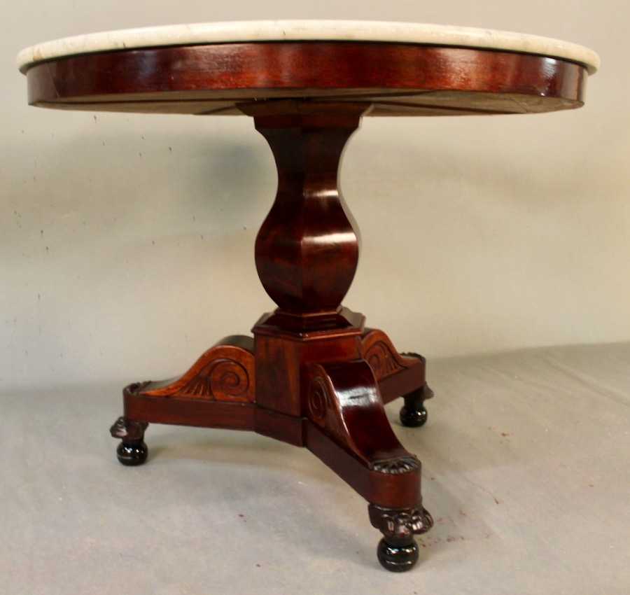 Il est coiffé d'un marbre blanc. Le plateau repose sur un pied central de forme balustre à pans coupés et sur un piètement tripode se terminant en patte de lion.