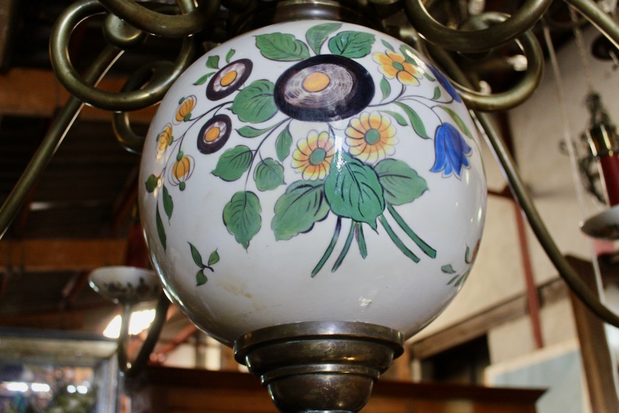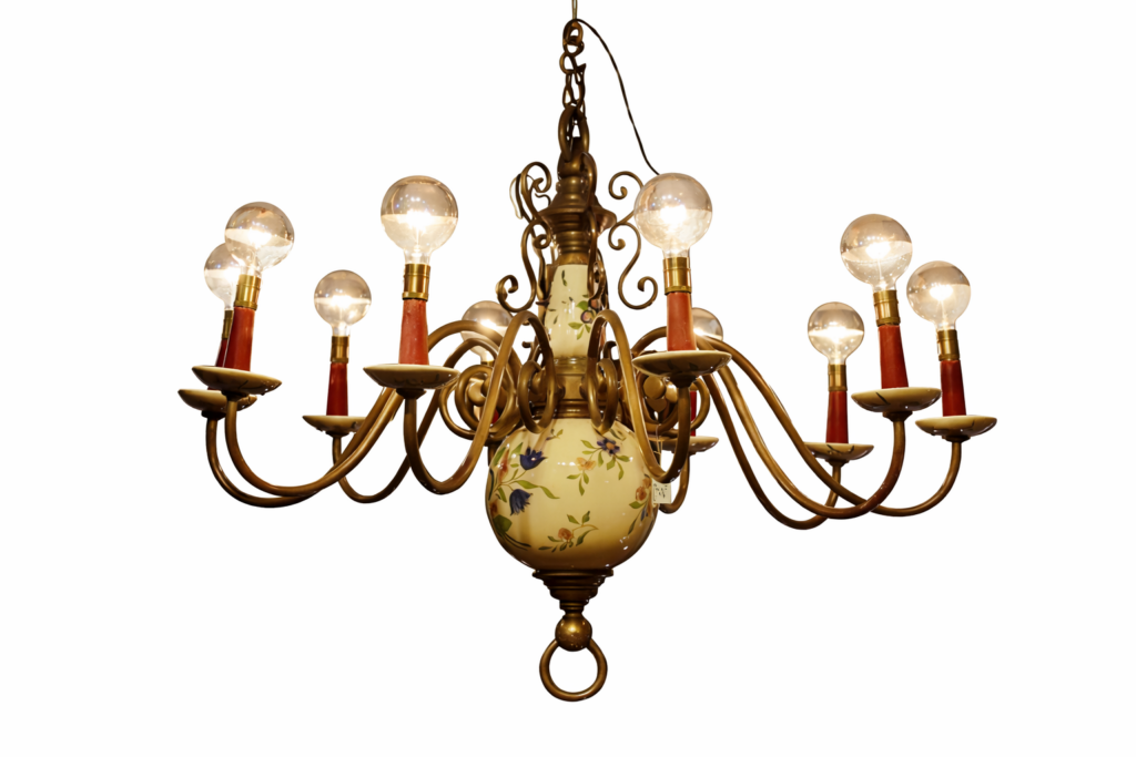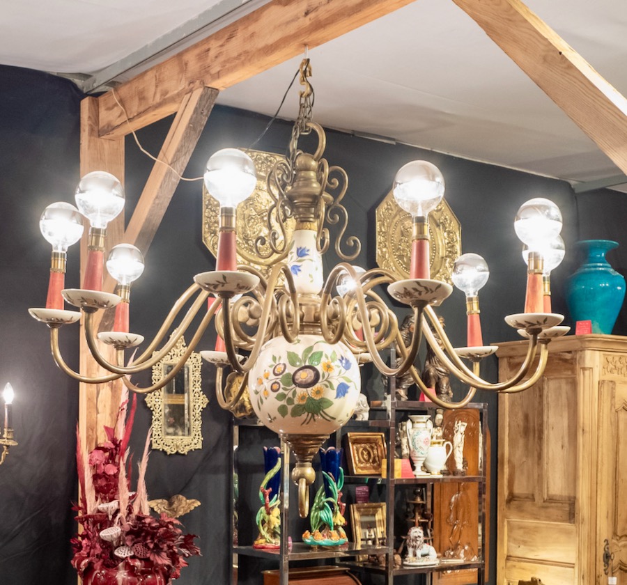 Important lustre hollandais à 10 bras de lumière en bronze laiton, et faience de Saint Clément.