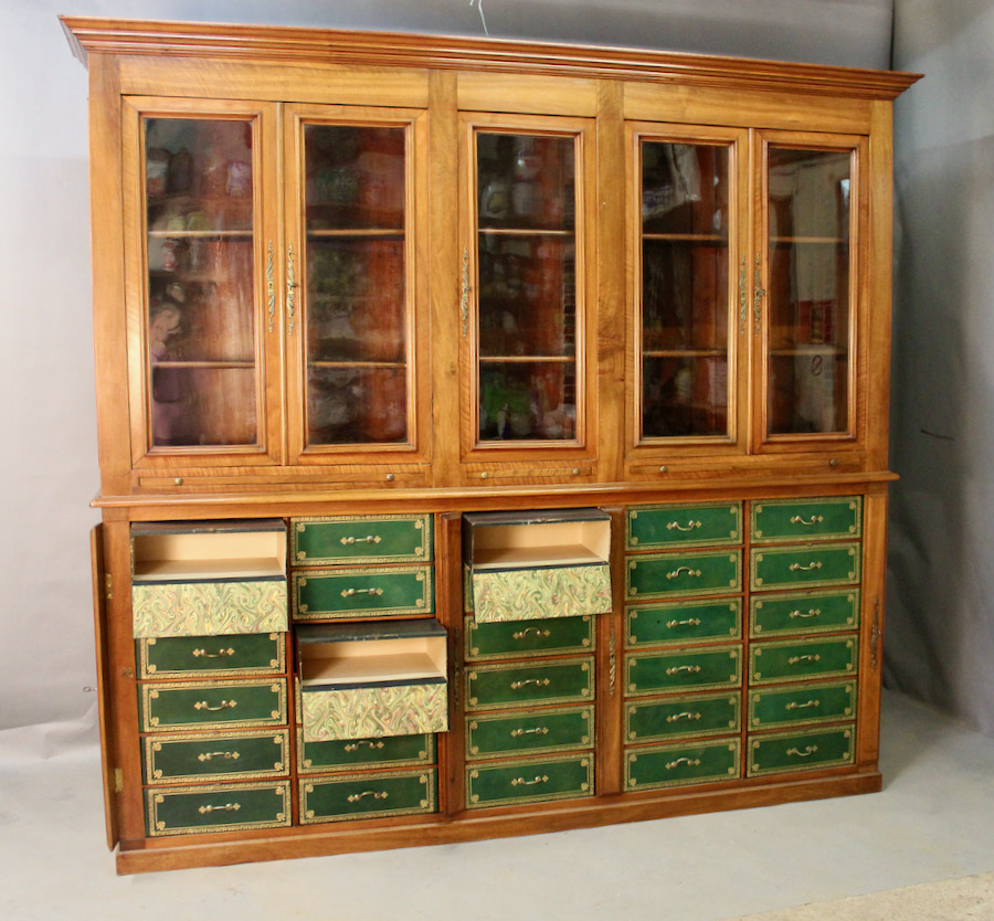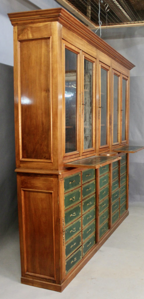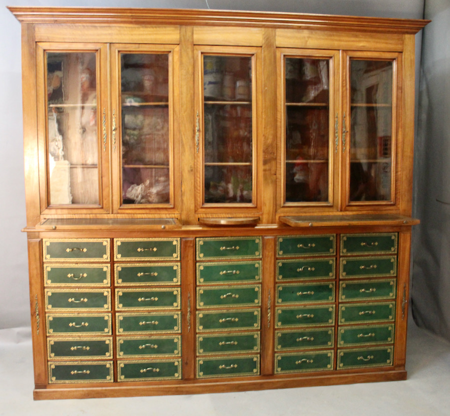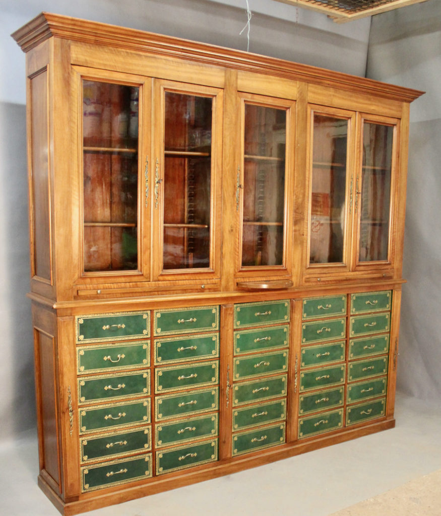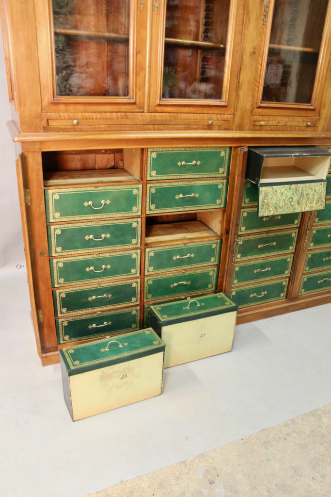 Importante bibliothèque cartonnier en acajou. Elle ouvre par 5 cinq portes vitrées et 30 boites de rangement en carton.