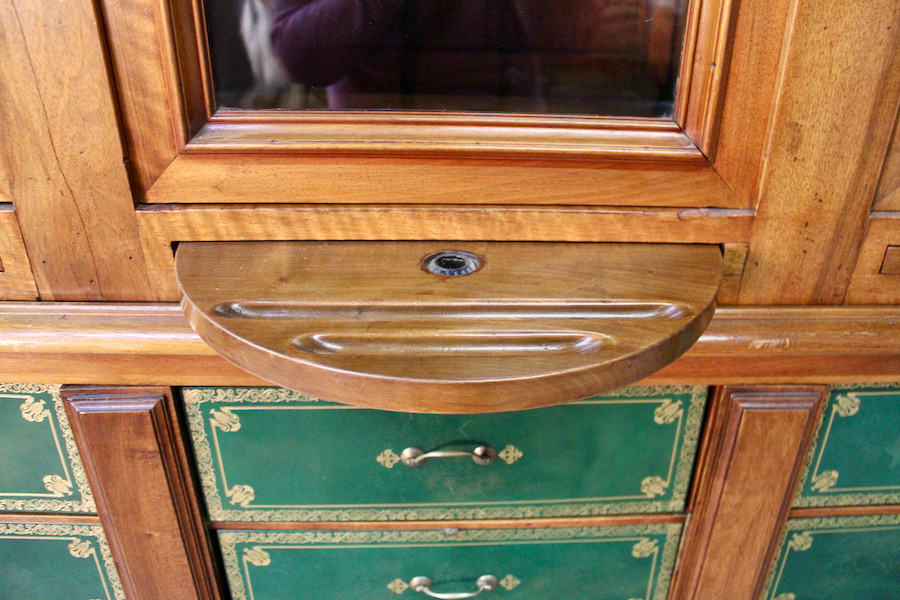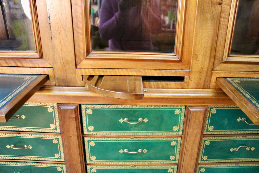 Elle possède 2 tirettes habillées de cuir en façade, et un demi cercle faisant office d'encrier. Profondeur des tirettes 29 cm