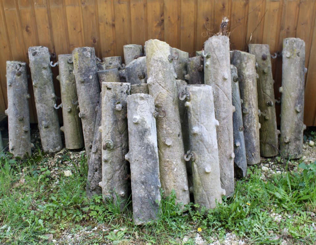 Les piliers sont en pierre massive et les faux noeuds en bois sont en pierre reconstituée, technique des années 30.