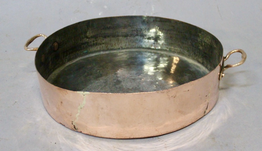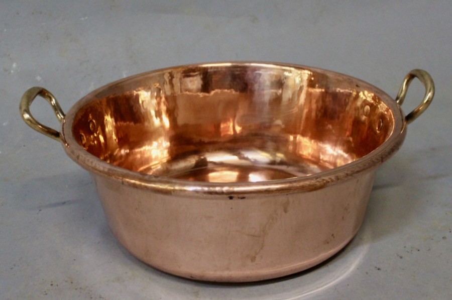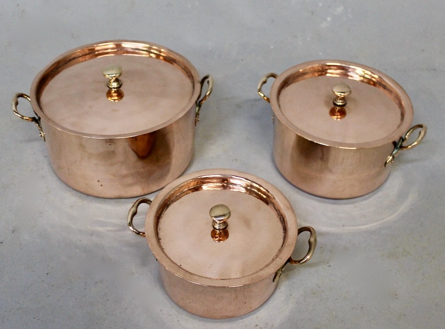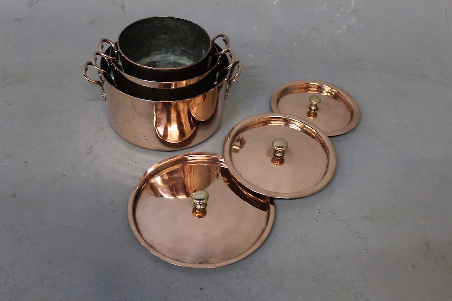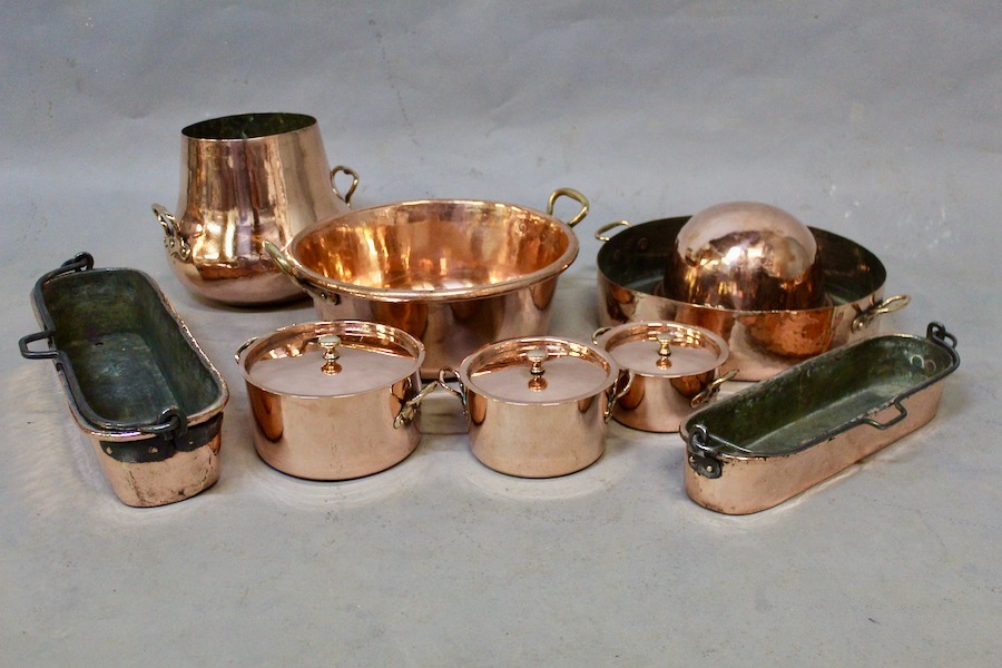 Chaudron, deux poissonnières, 3 casseroles avec couvercles, un fait tout, une marmite à confiture, un cul de poule.