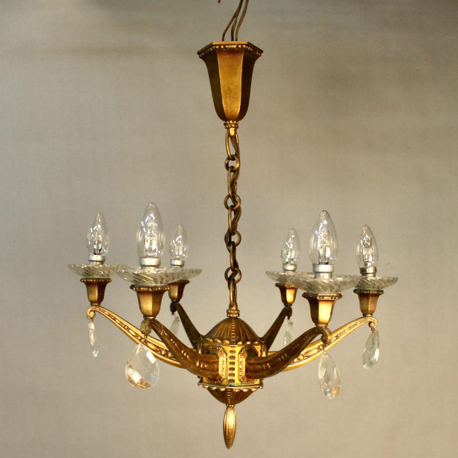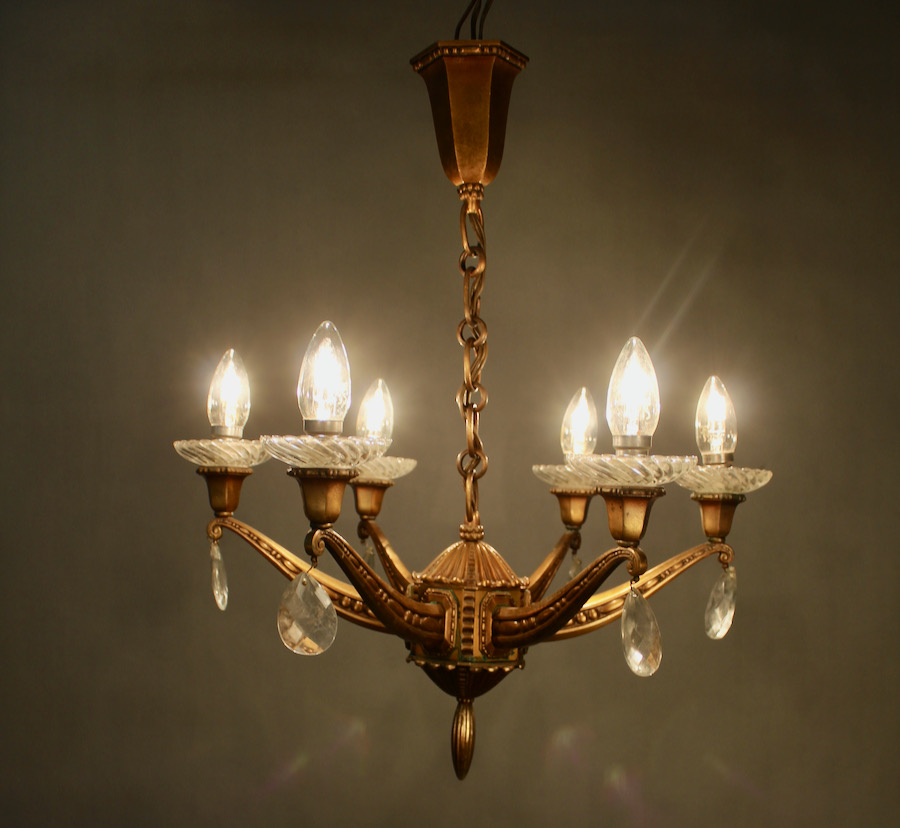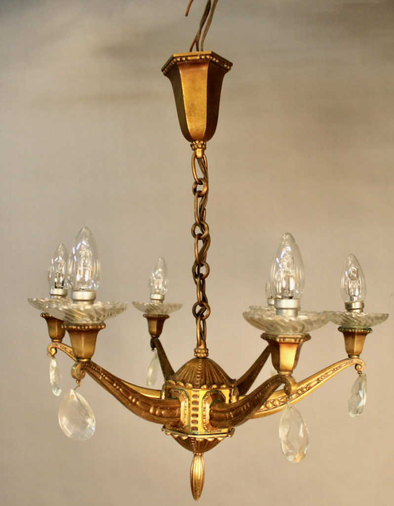 Lustre en bronze plein à 6 bras de lumière avec pampilles et coupelles en verre.