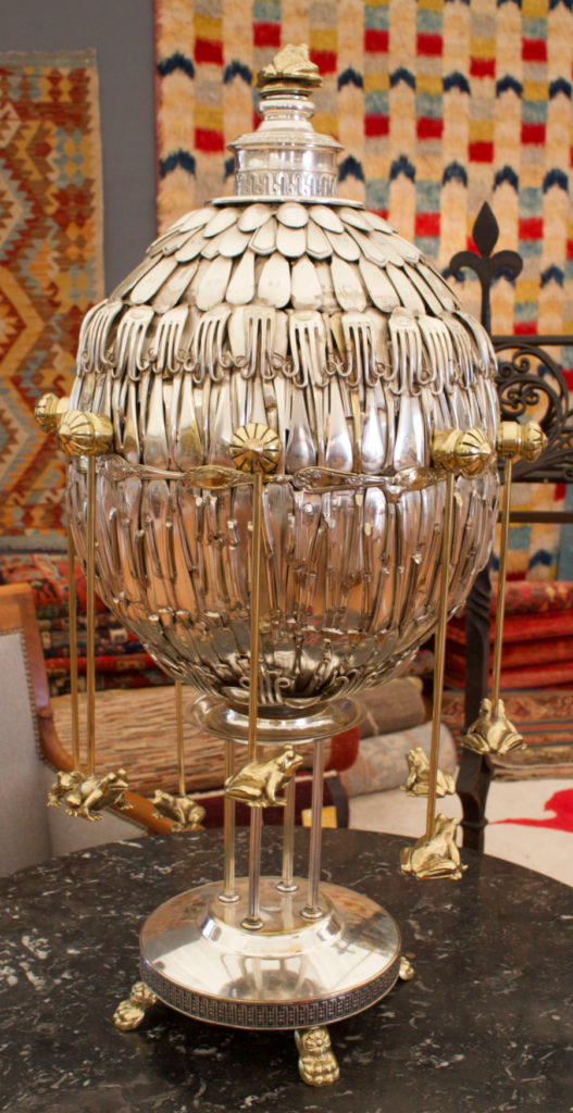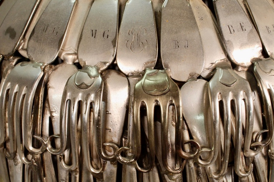 L'artiste récupère, classe, plie les couverts puis les soude à l'argent.