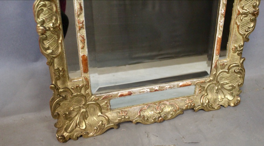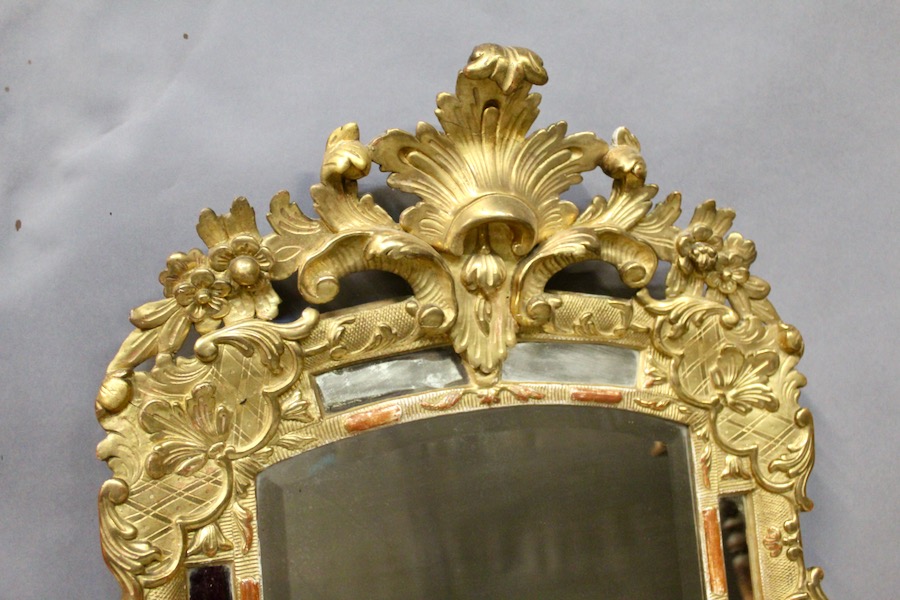 Le miroir est coiffé d’un généreux fronton ajouré. La sculpture centrale est une large feuille d’acanthe, accompagnée de guirlandes de fleurs.
