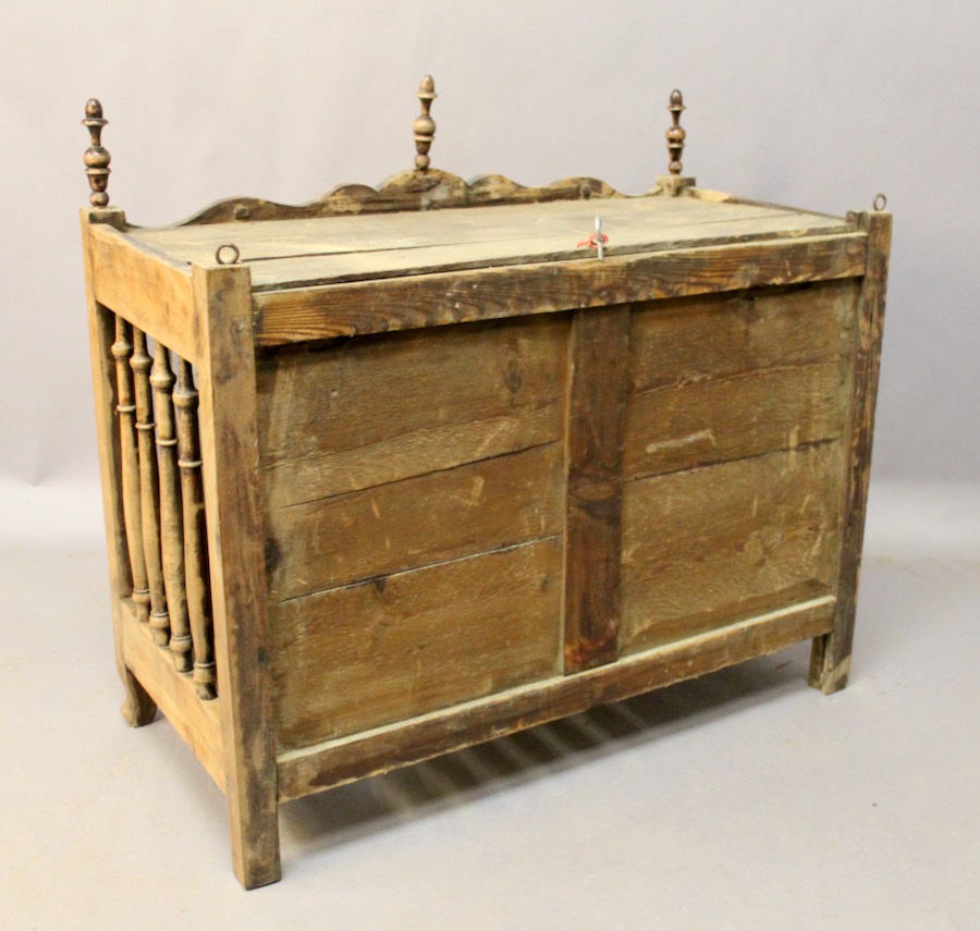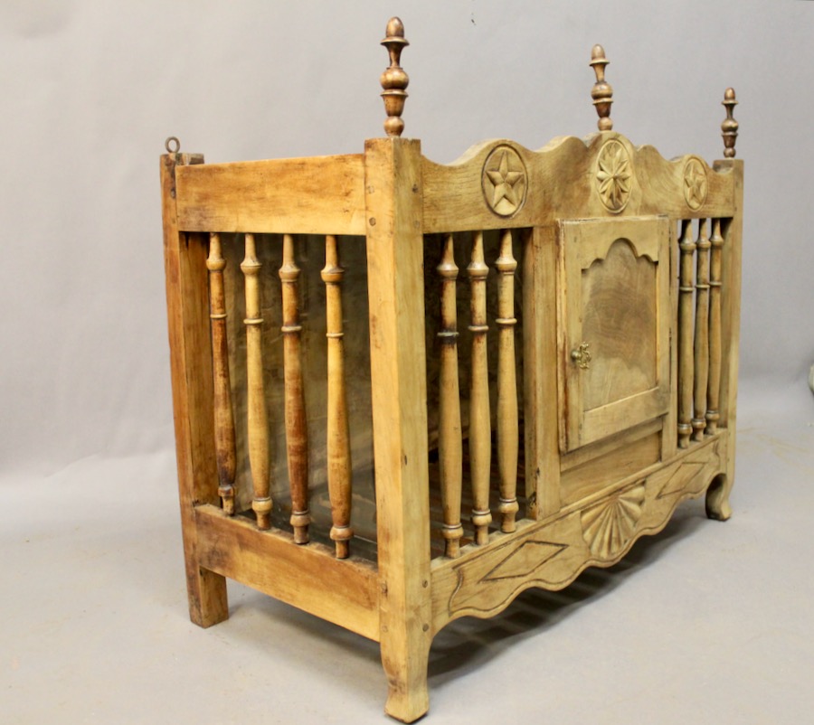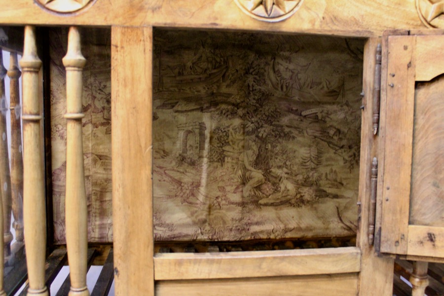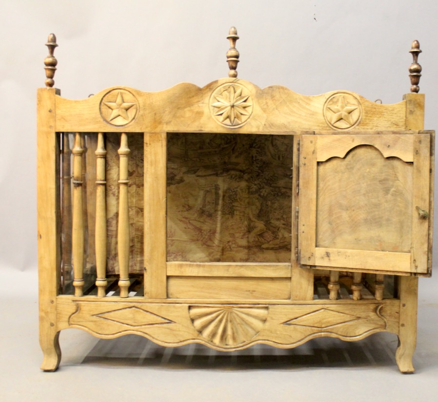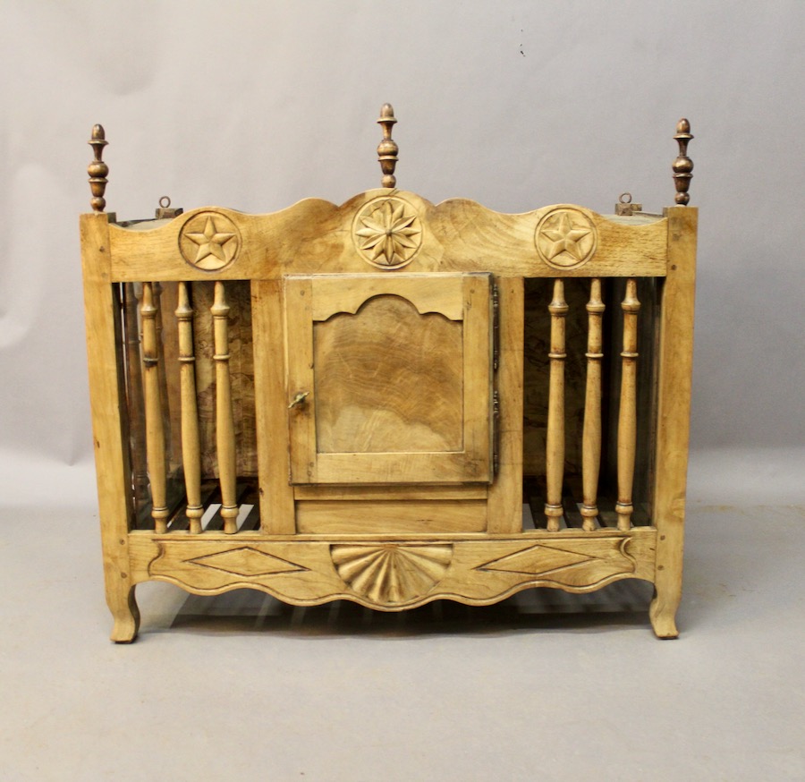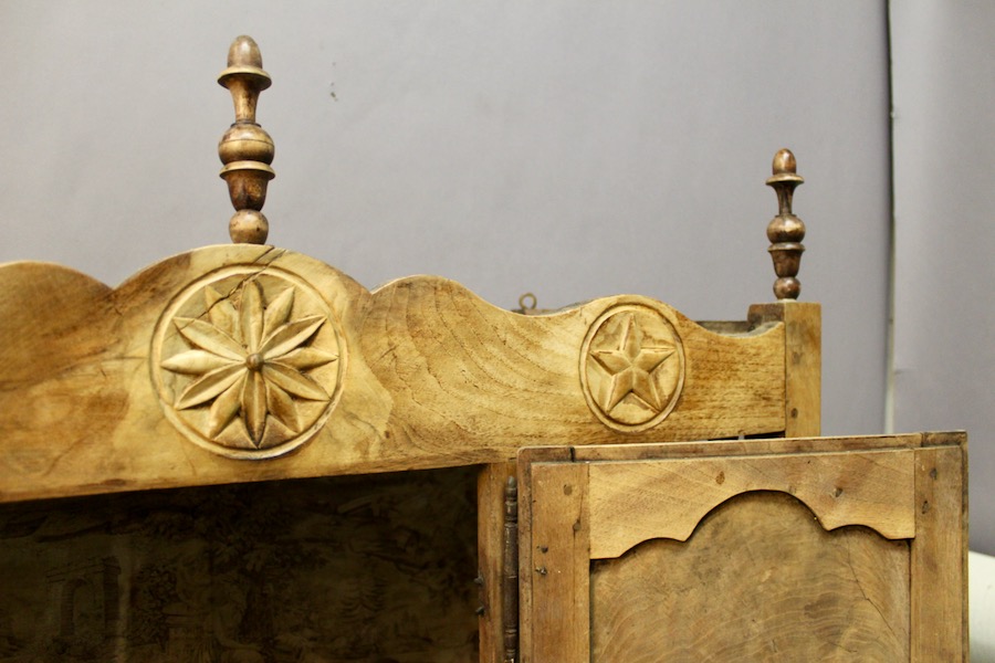 Panetière en noyer sculpté sur la traverse du haut et la traverse du bas, d'époque XIXème, ajourée sur trois cotés par des barreaux tournés en balustre. Elle ouvre par une porte à cadre sur un fond tapissé. Les deux cotés sont vitrés.
