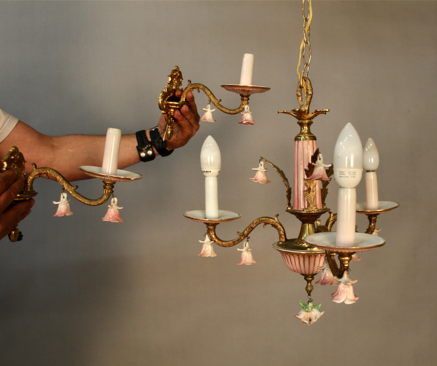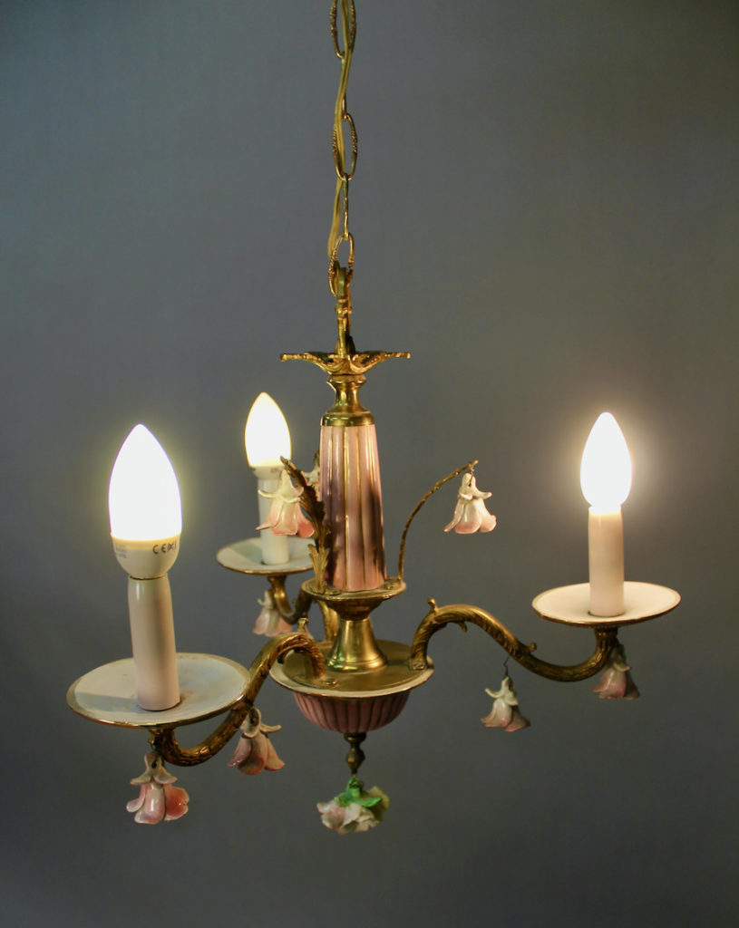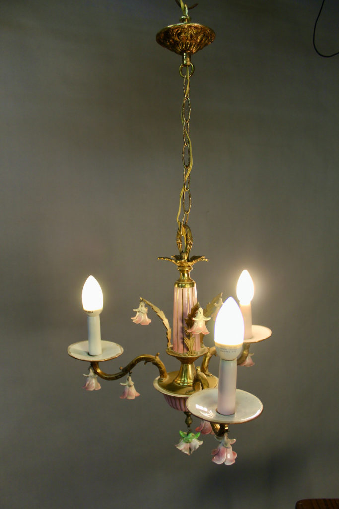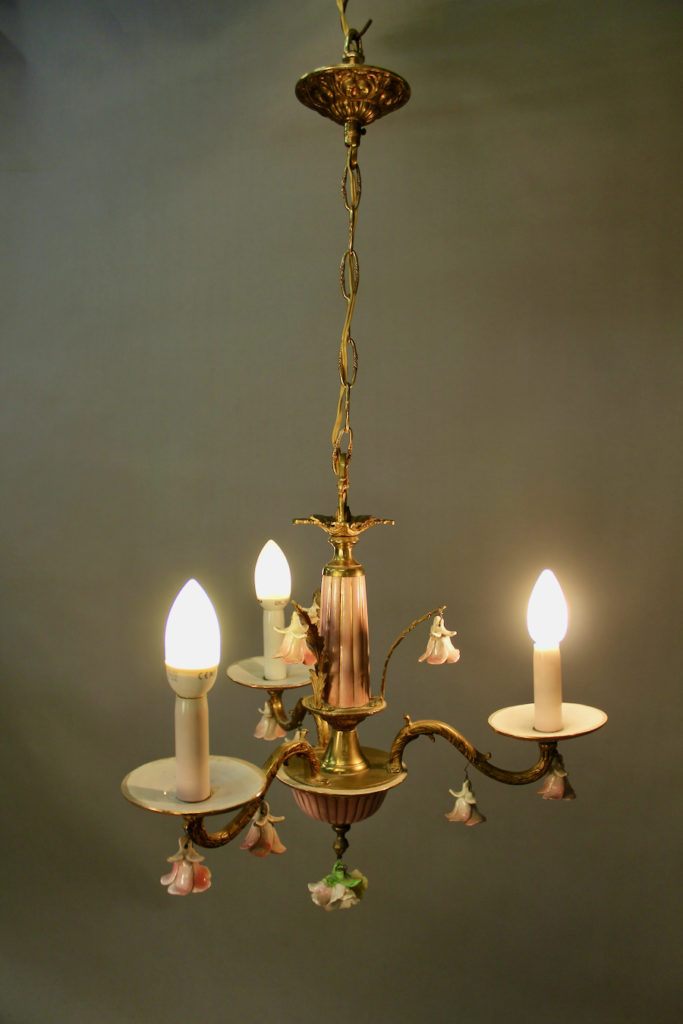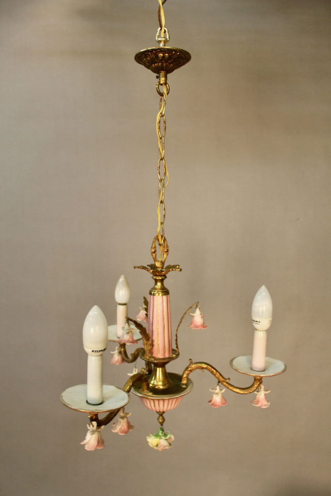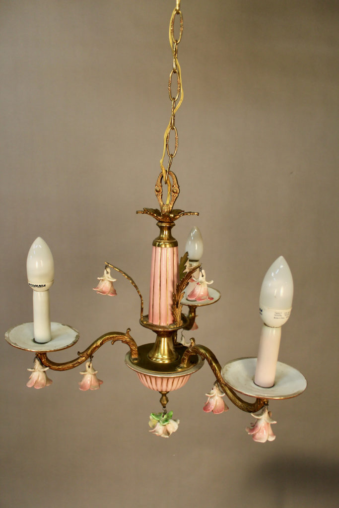 Petit Lustre Italien En Bronze Et Fleurs En Porcelaine Avec Ses 2 Appliques