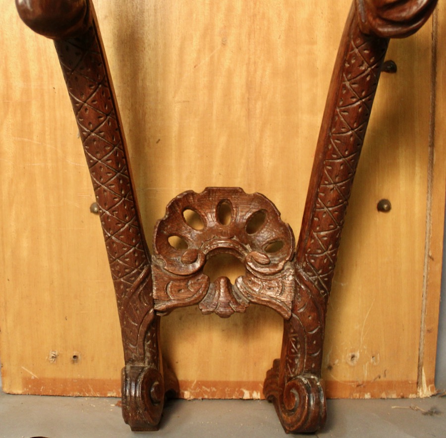 Elle repose sur deux pieds rejoints par une coquille sculptée.