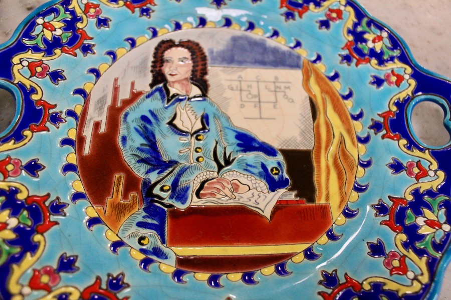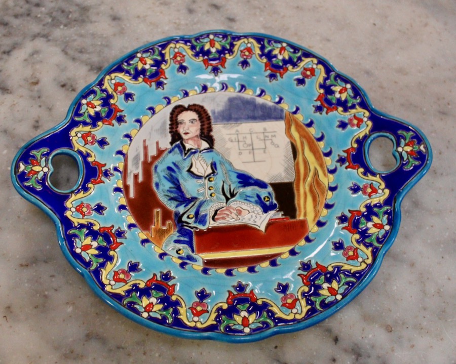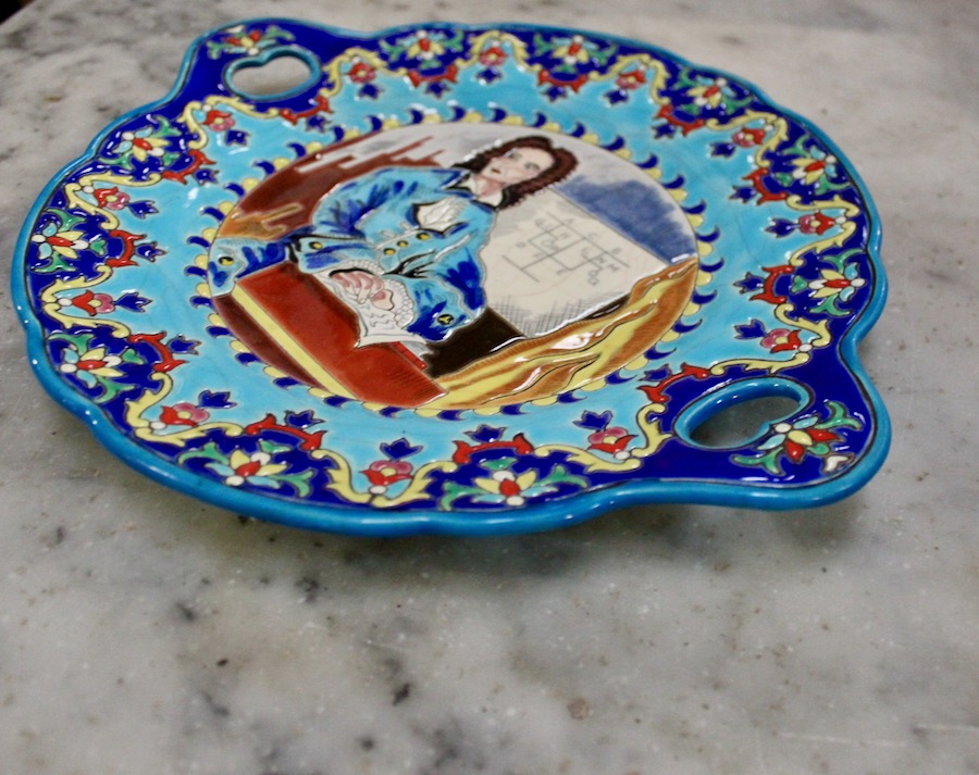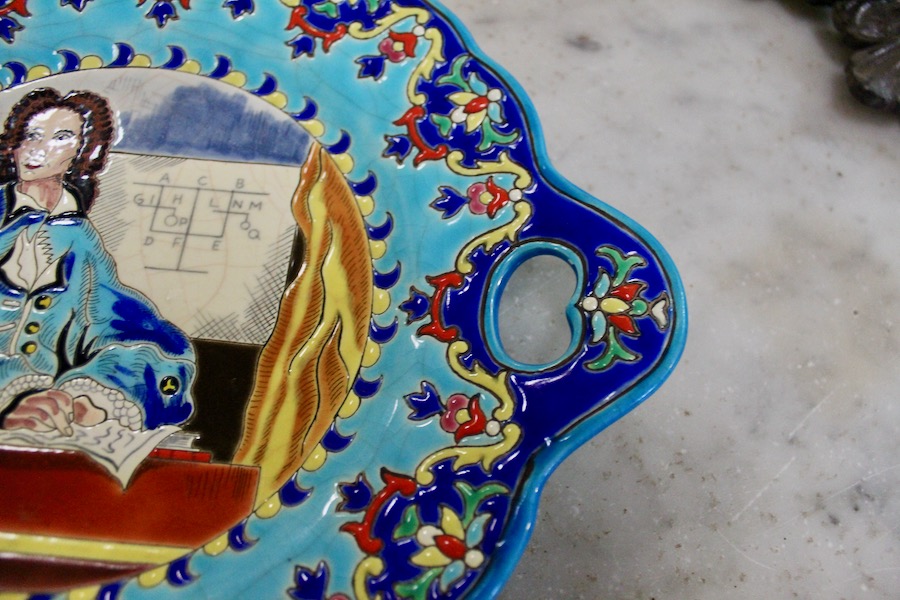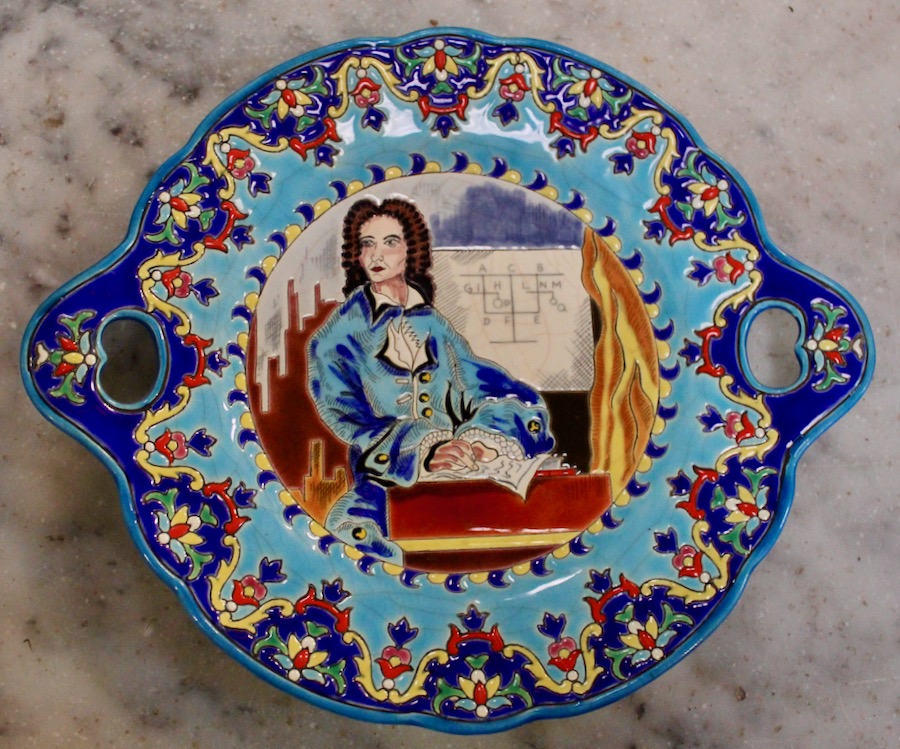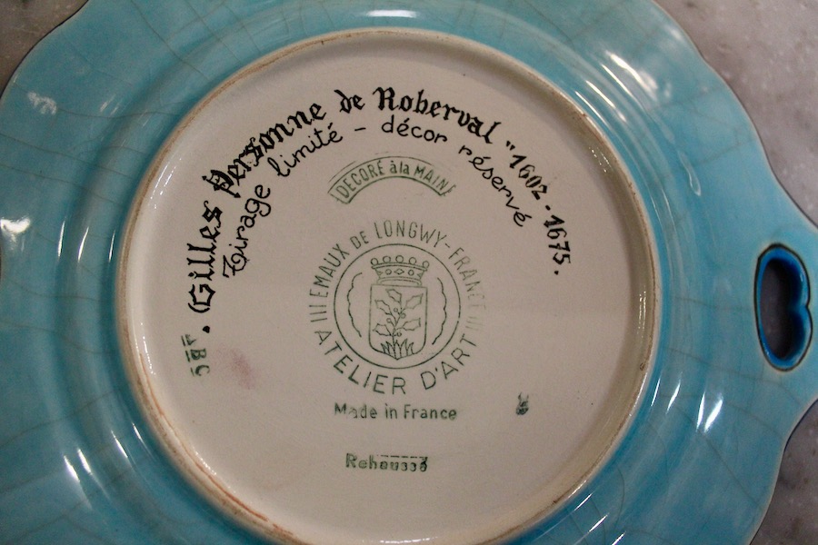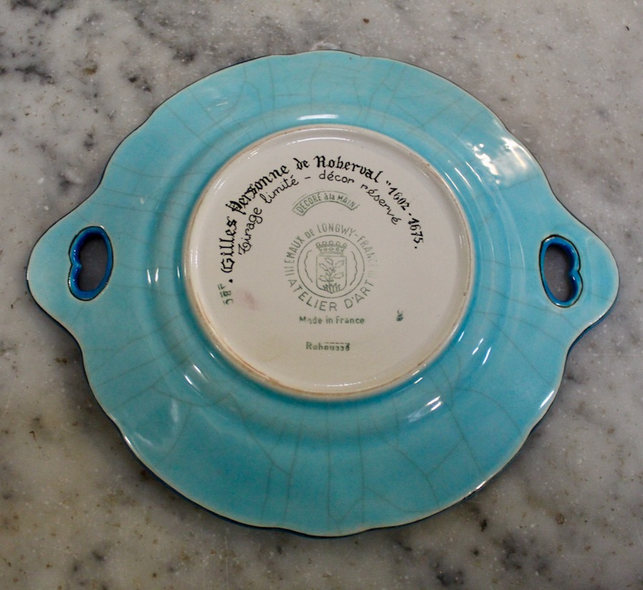 Plat à anses en Emaux de Longwy , tirage limité, représentant Gilles Personne de Roberval (1602-1675). Mathématicien inventeur de la balance à deux fléaux dite Balance de Roberval.