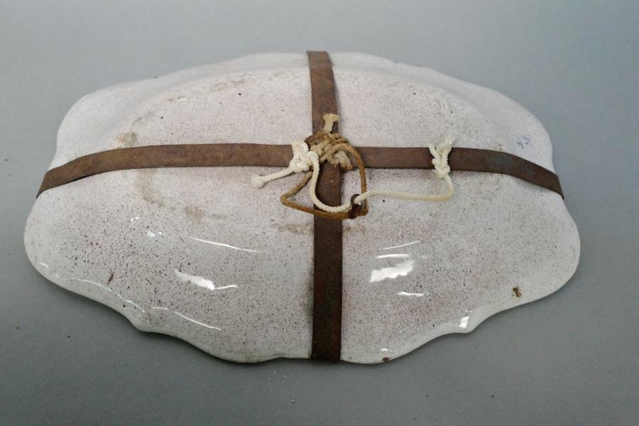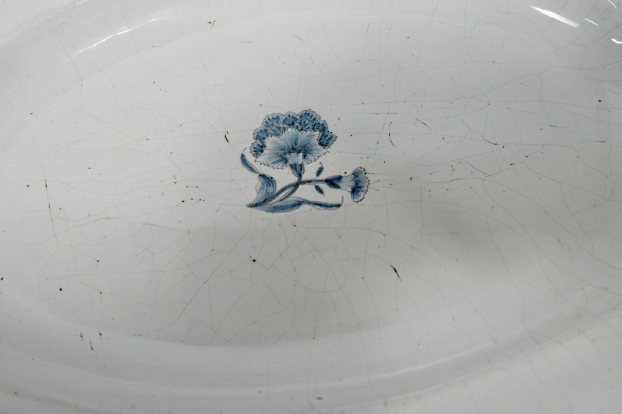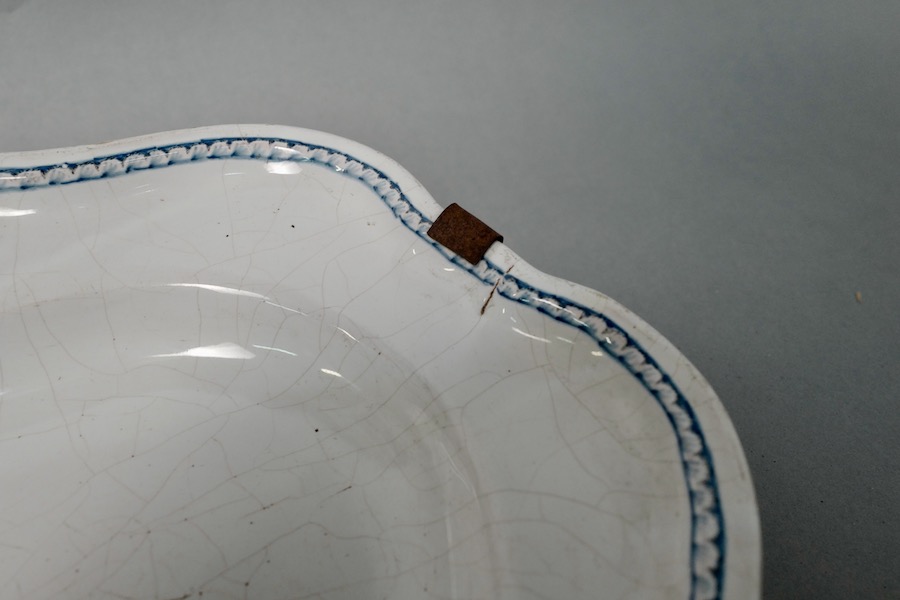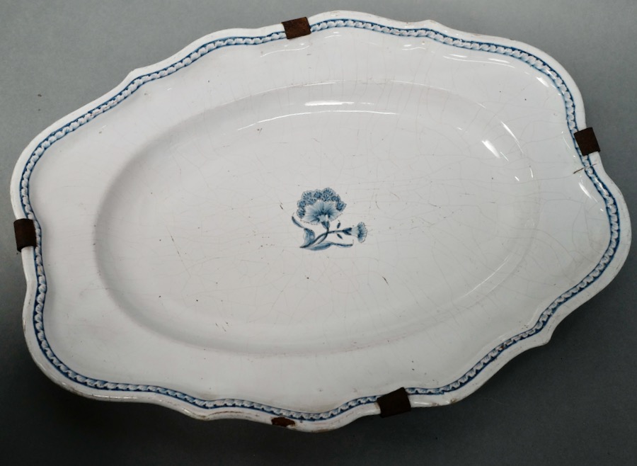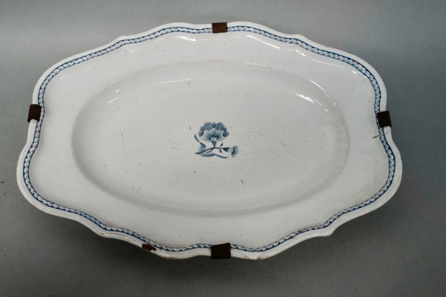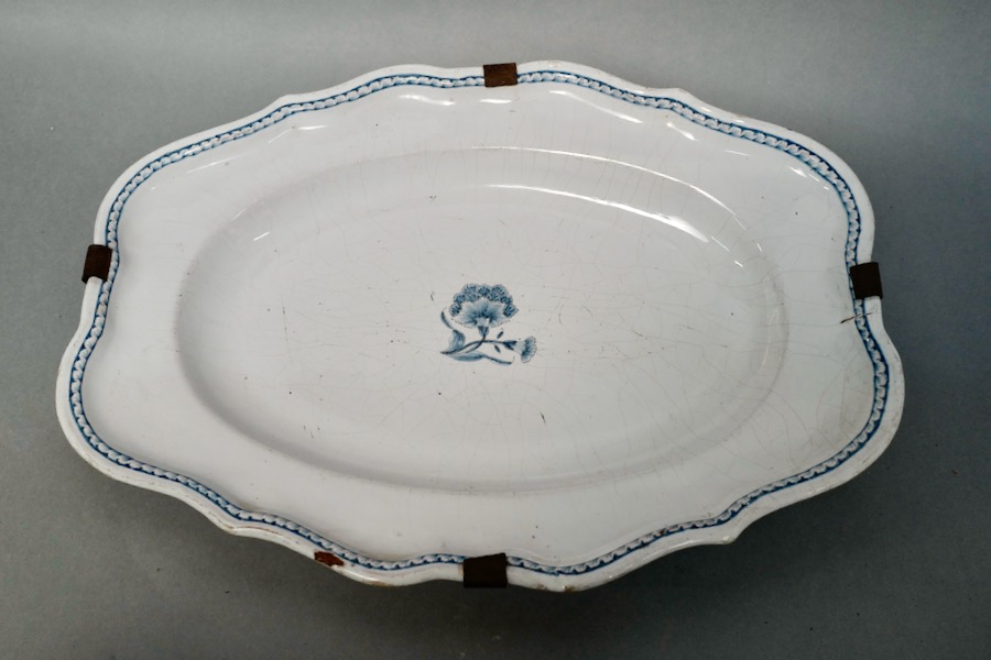 Plat en faience de Moustiers XVIIIème à bord chantourné peint d'une frise stylisée et orné en son centre de fleurs bleues.