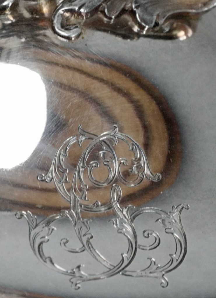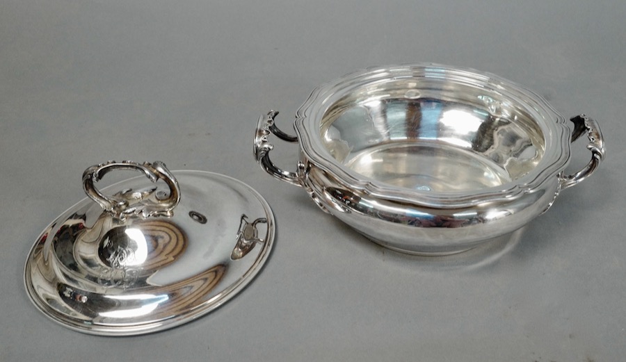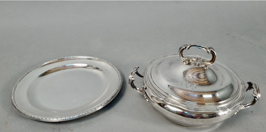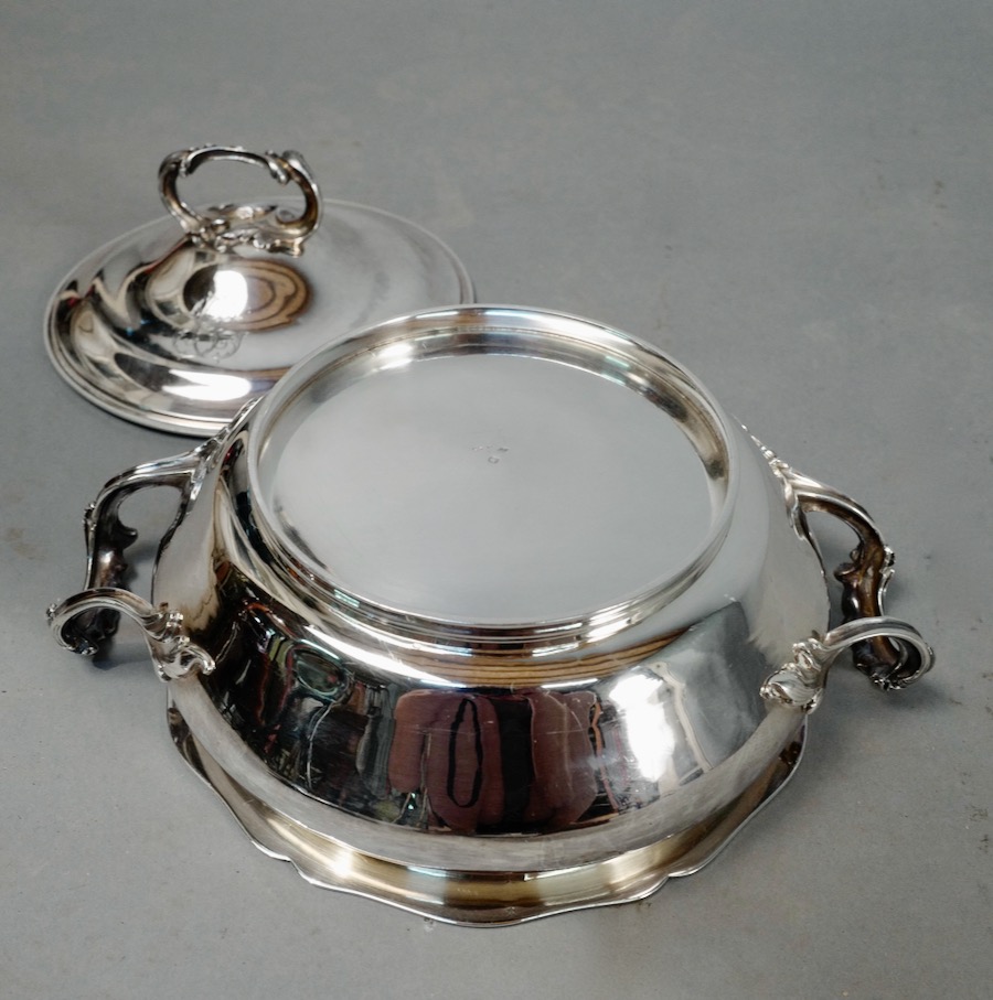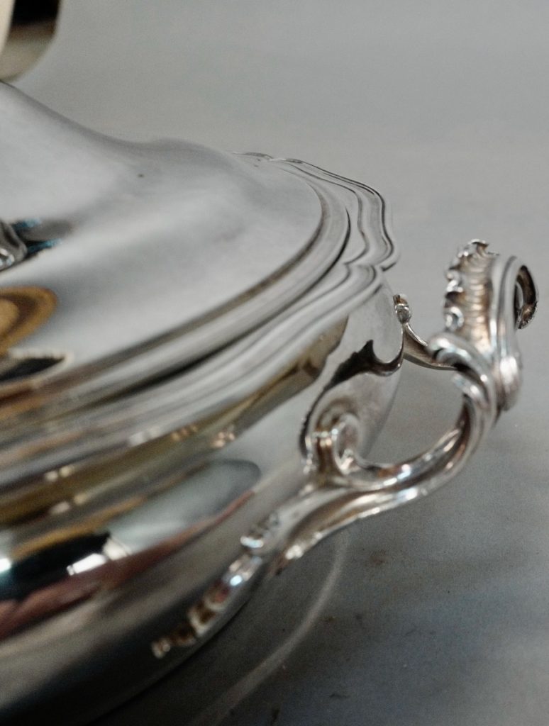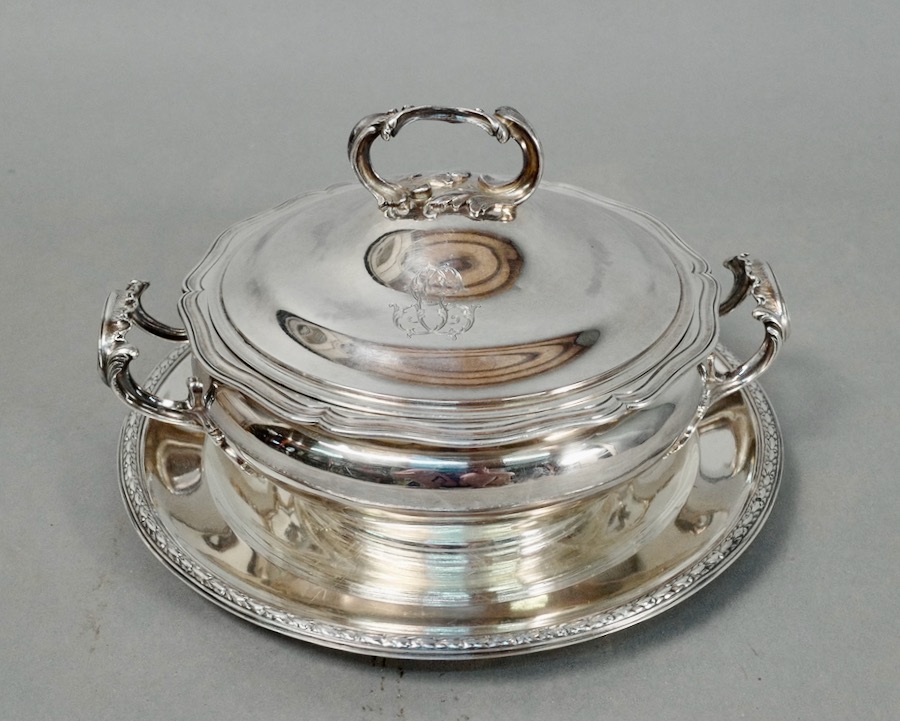 Soupière sur présentoir en métal argenté, monogrammée GC.