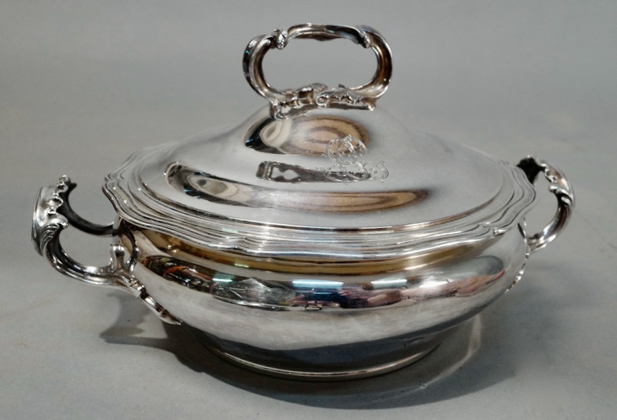 Soupière Sur Présentoir En Métal Argenté Monogrammée Gc