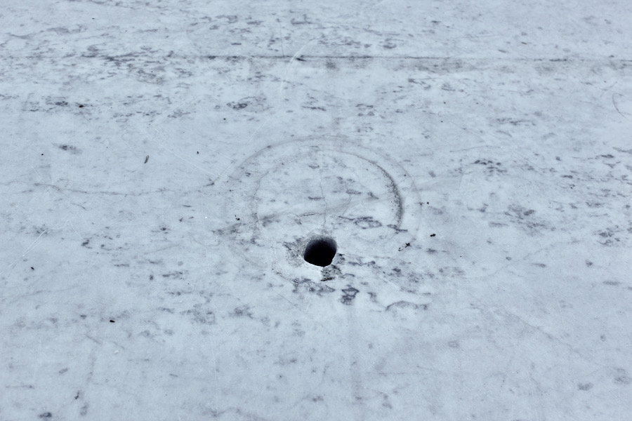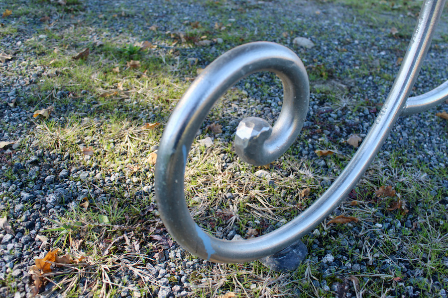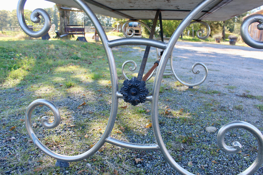 Elle repose sur un piètement en fer forgé chromé avec entretoise à sertissage en plomb.