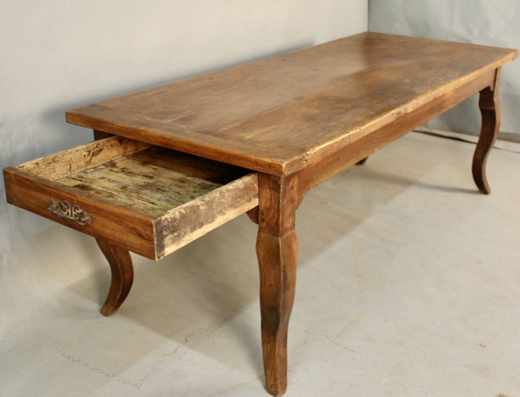 Cette table est dotée de deux grands tiroirs à chaque extrémité avec poignées de tirages en fer forgé. La profondeur des tiroirs est de 85 cm.