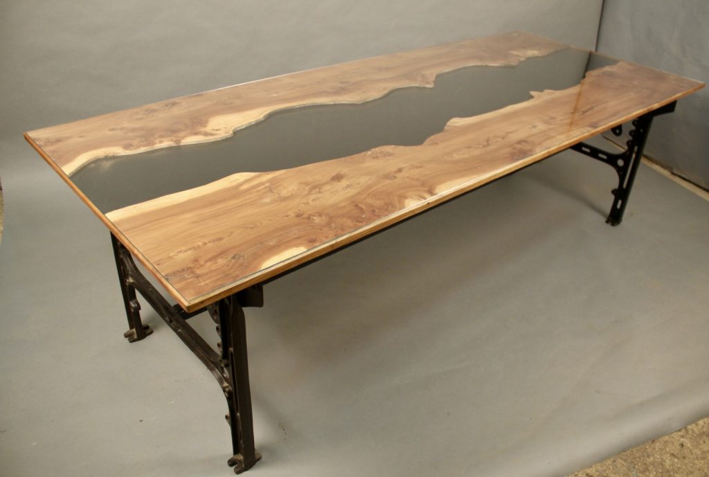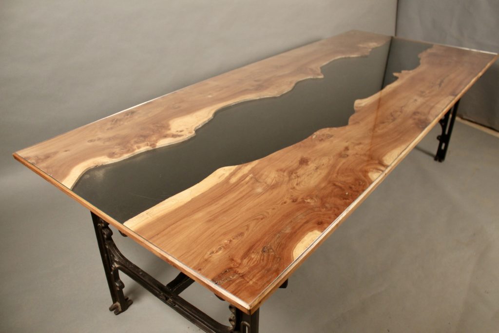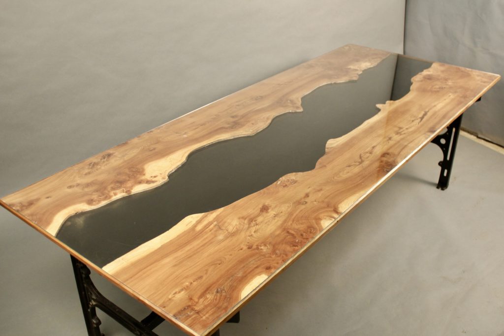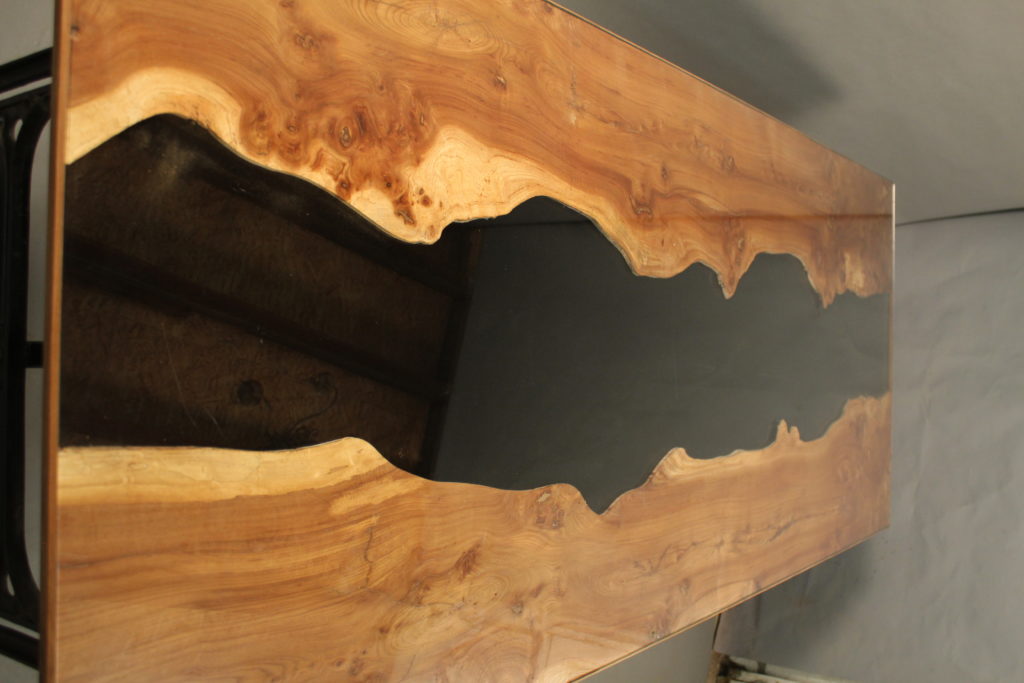 Dessus de verre, loupe d'orme et verre teinté noir entre les deux parties bois.