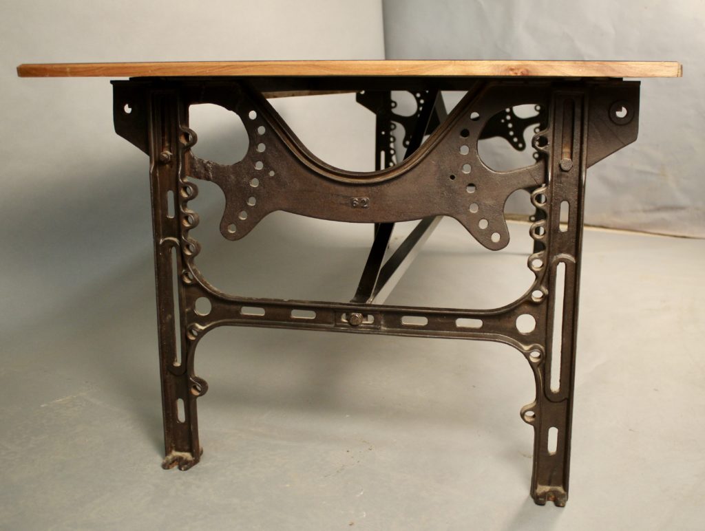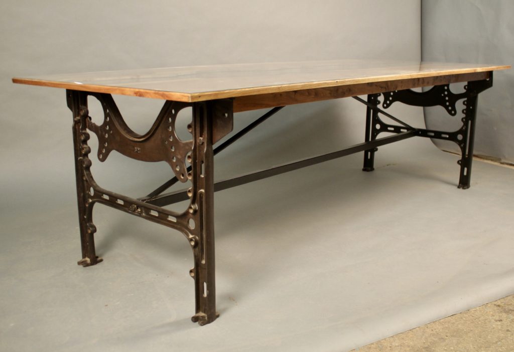 Table à piètement fer forgé, relié par une traverse.