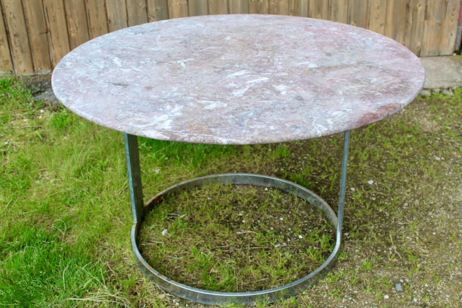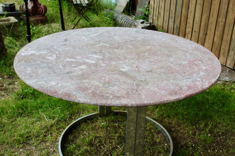 Table à plateau rond de marbre rose sur piètement chrome en deux parties.
