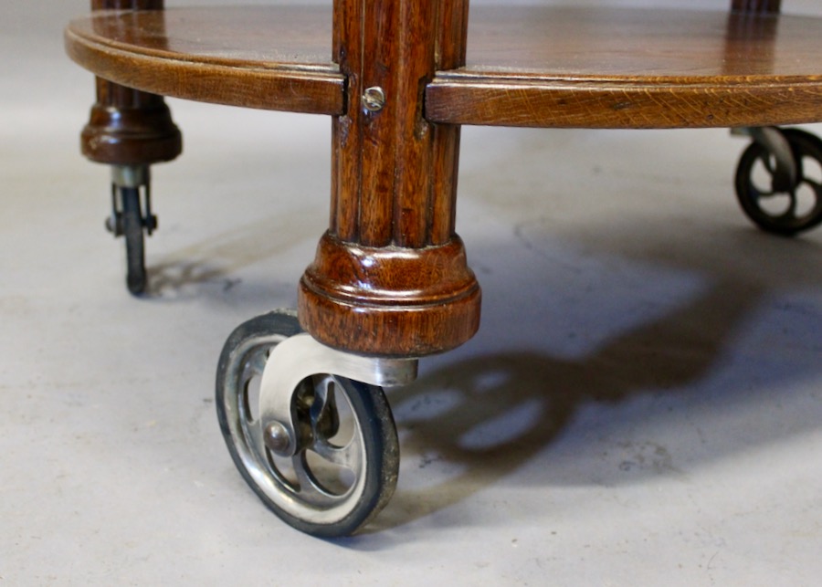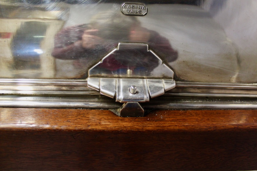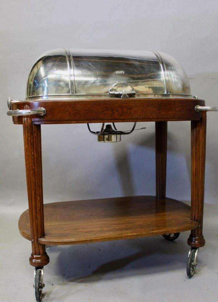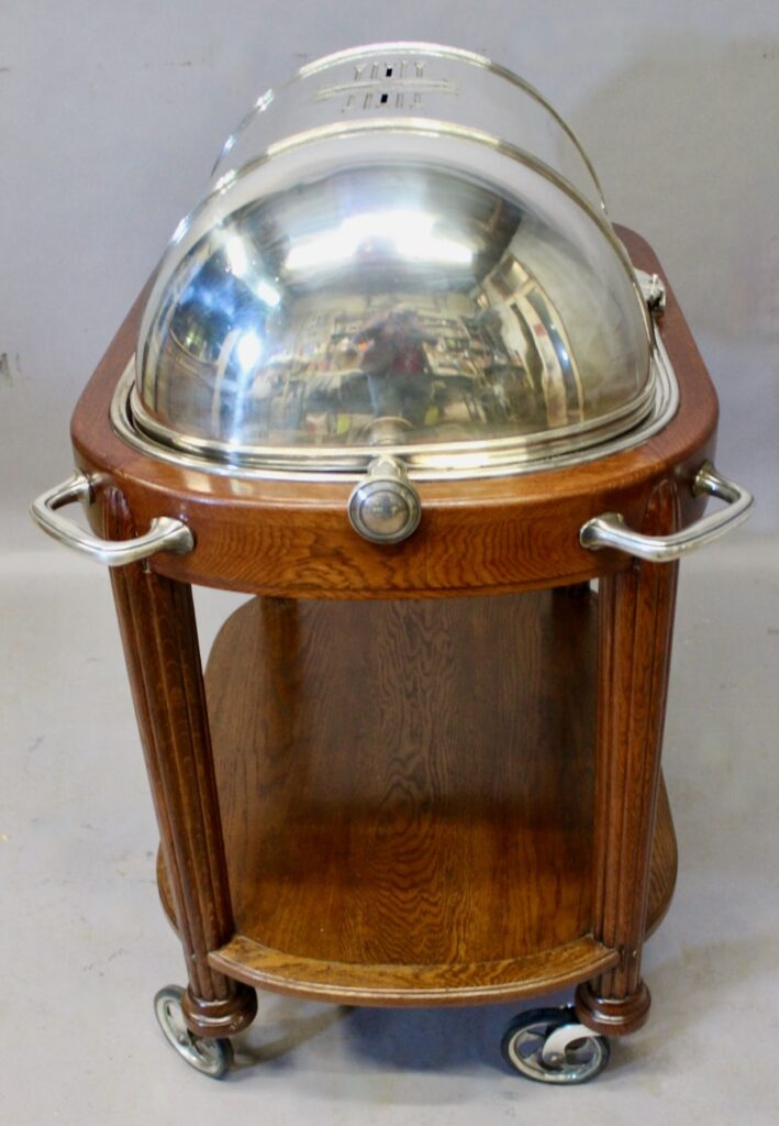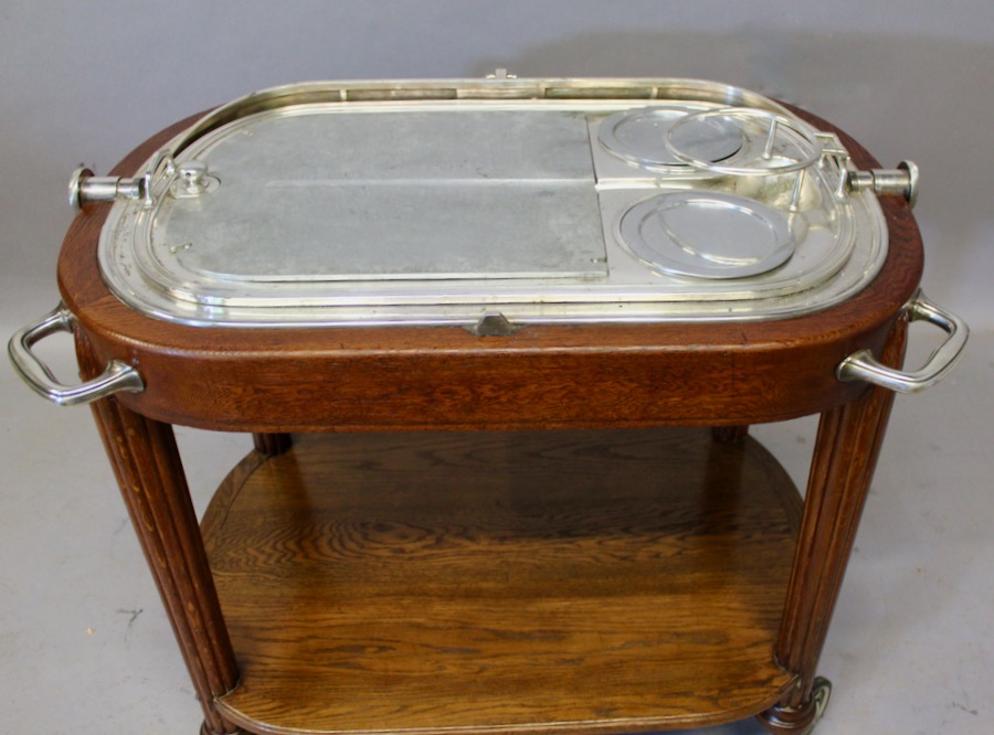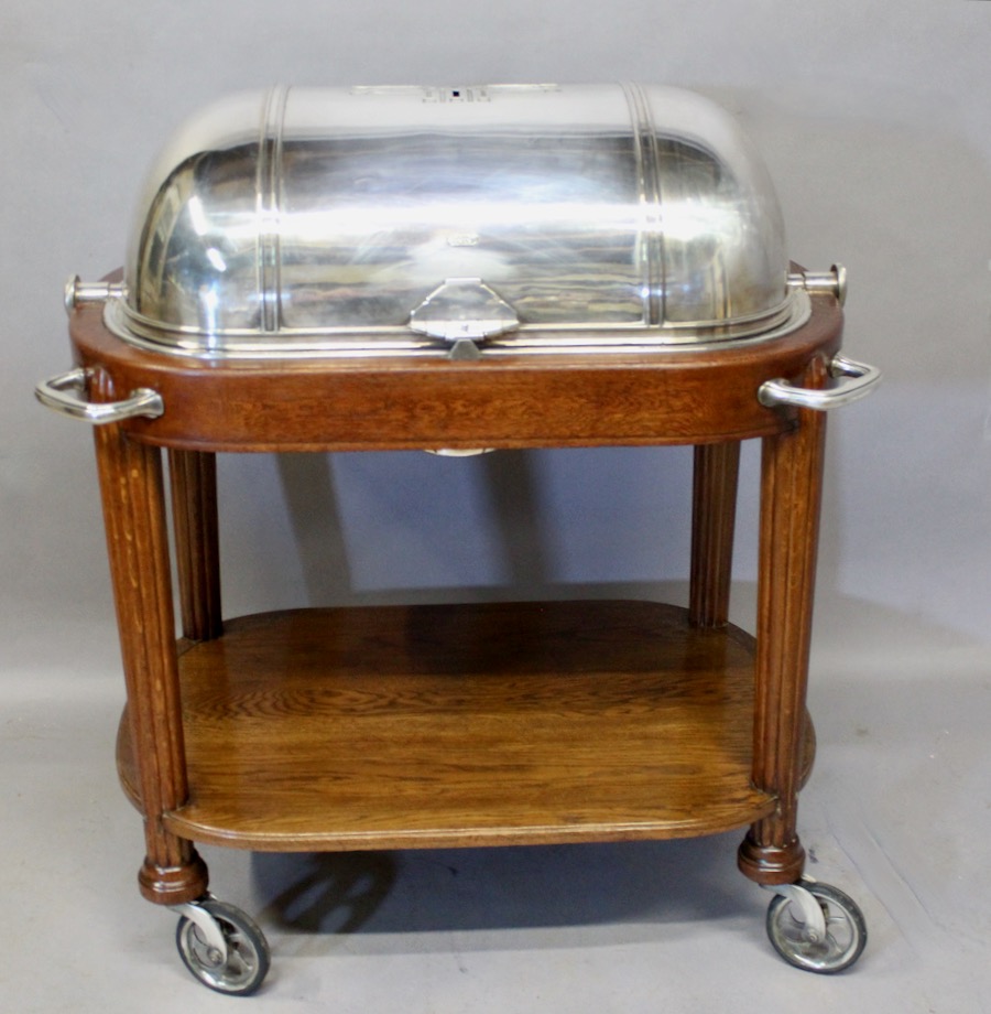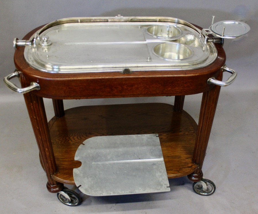 Table chaude, table roulante ou de présentation en chêne et métal argenté, poinçons de la maison Renaud et J Clermont à Genève, ART DECO