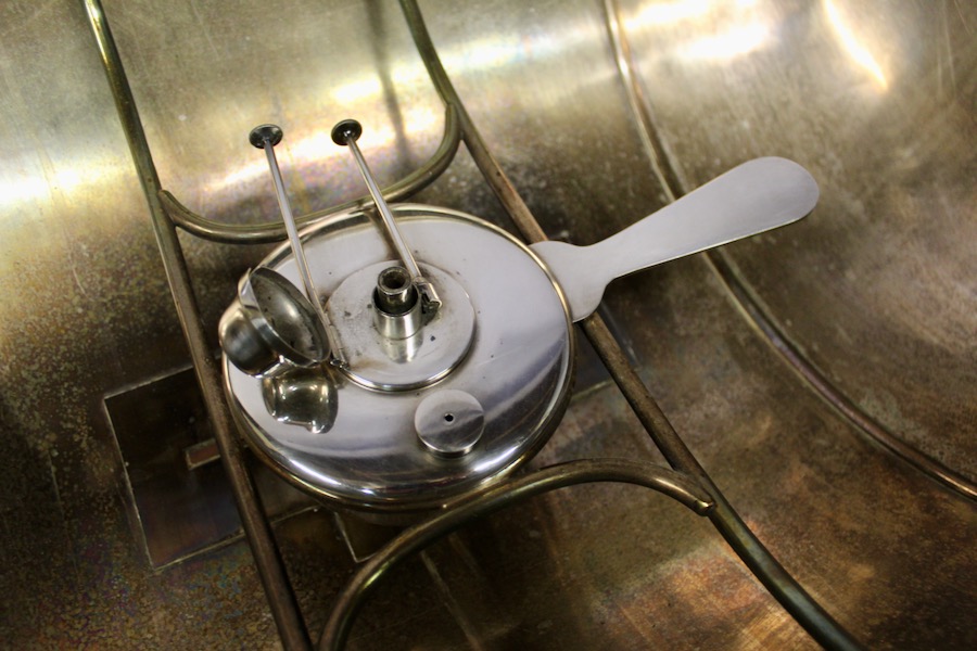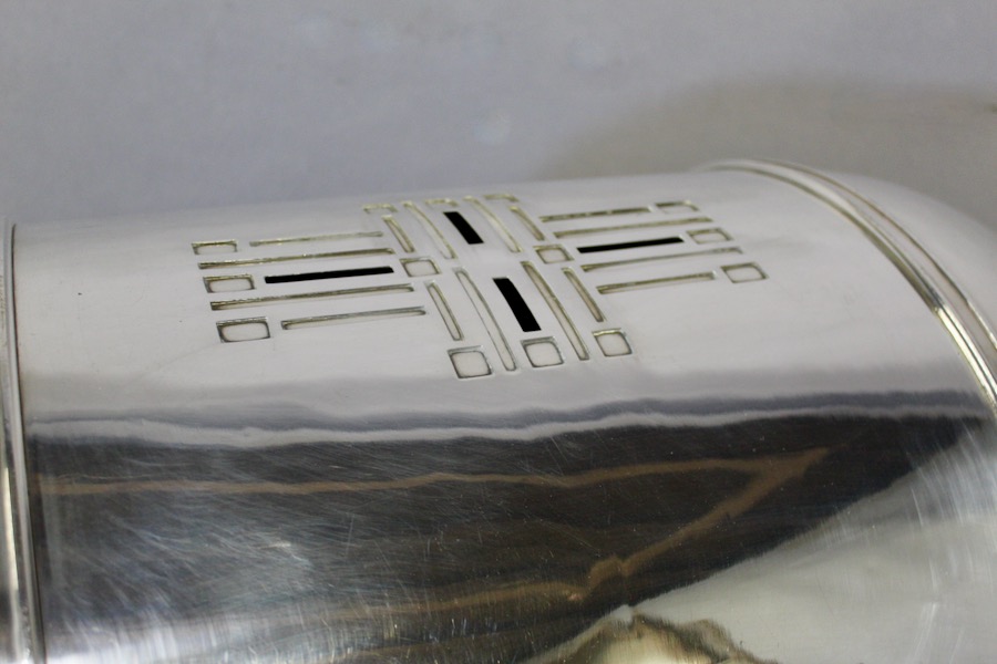 Elle ouvre par un cloche en métal argenté sur un bain marie amovible qui se réchauffe grace au réchaud à alcool. La cloche est ajouré d'un motif typiquement ART DECO.