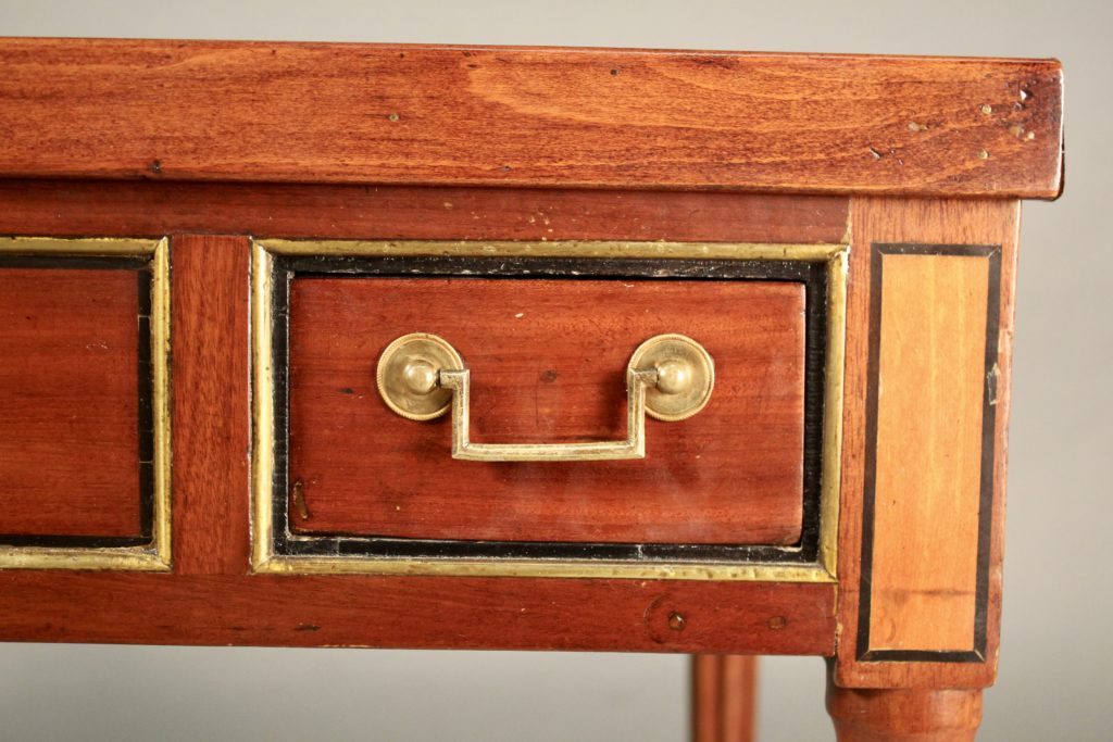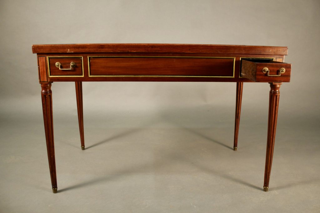 Le plateau amovible est gainé de cuir marron à frise dorée, le revers de feutre vert.