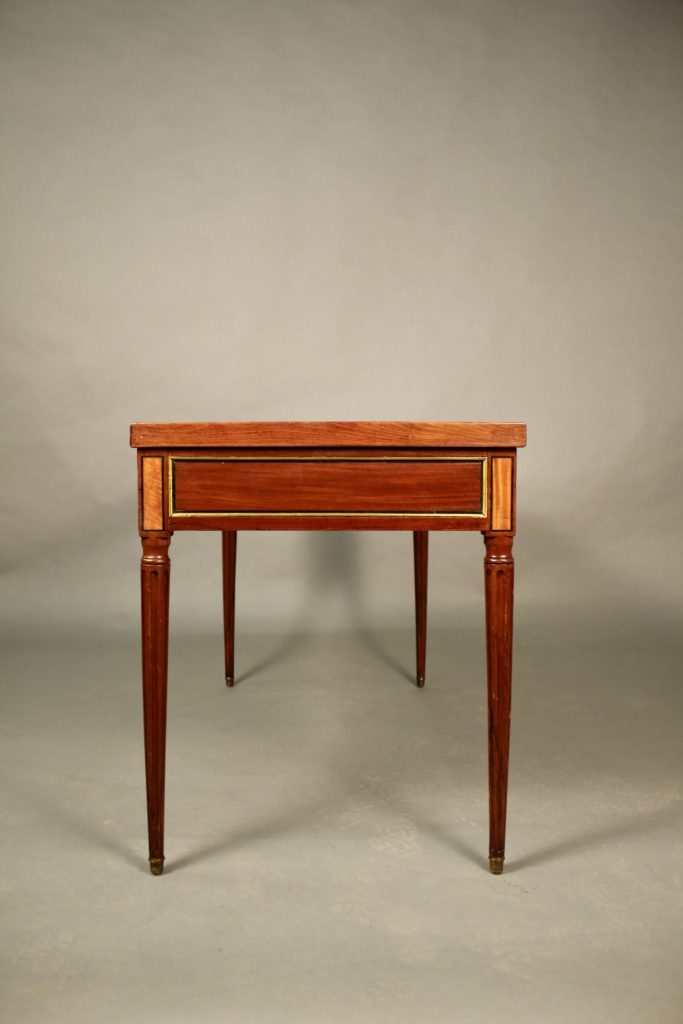 Elle repose sur 4 pieds cannelés, fuselés, à sabots en laiton bronze.