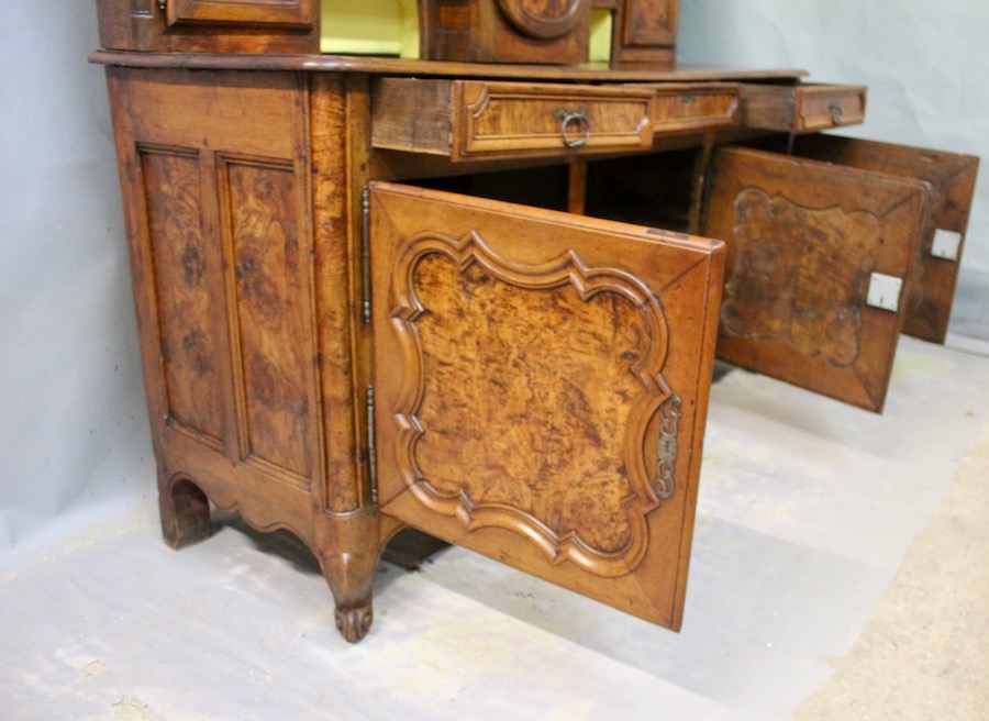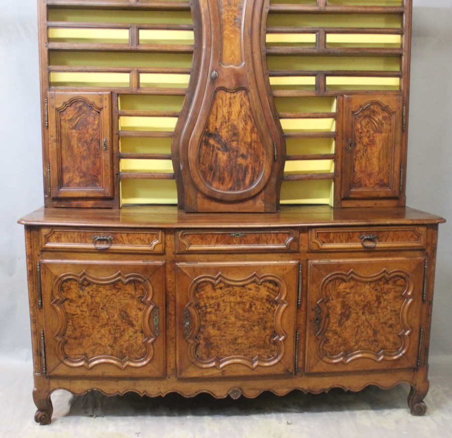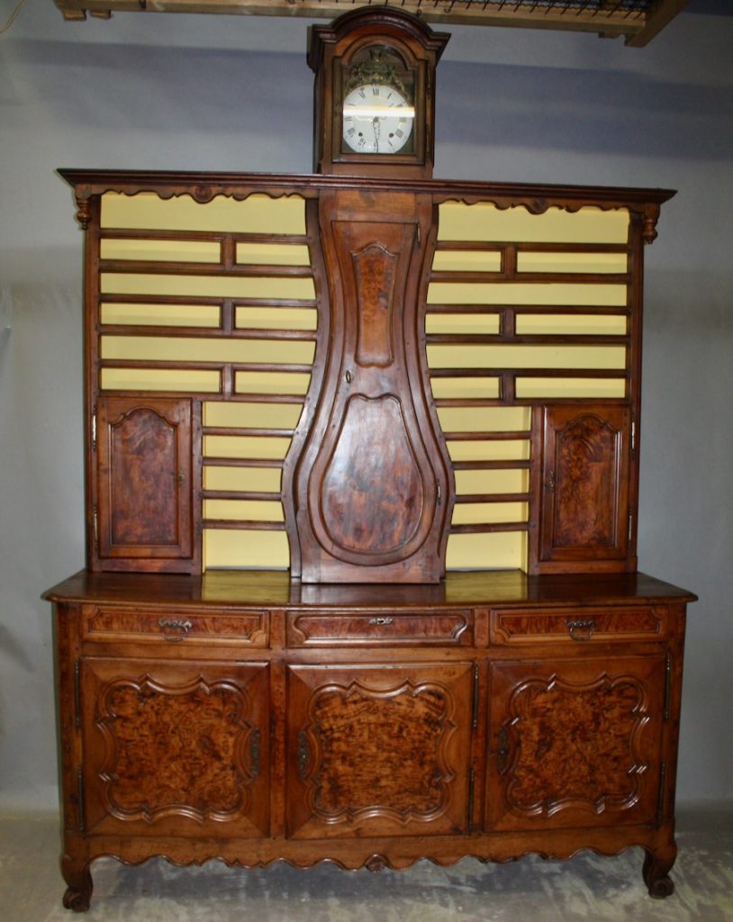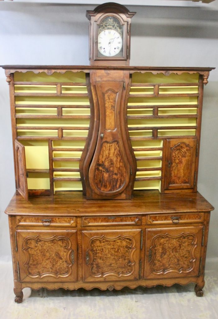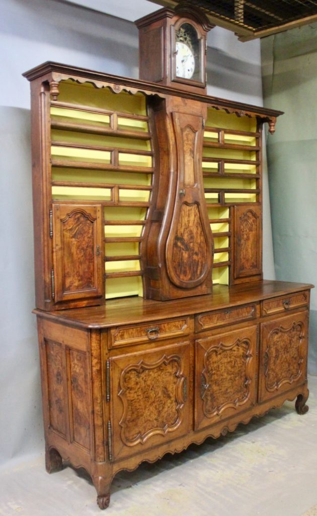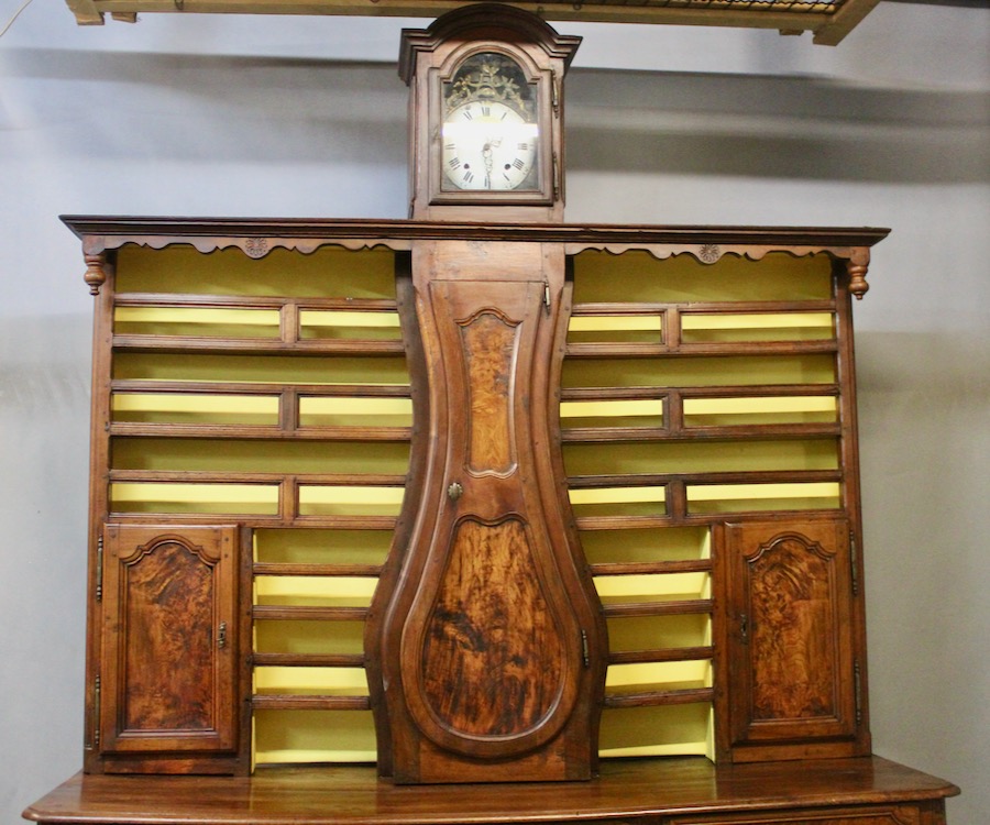 Important Vaisselier Horloge Bressan en loupe de frêne et noyer massif XVIIIème