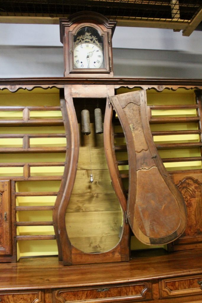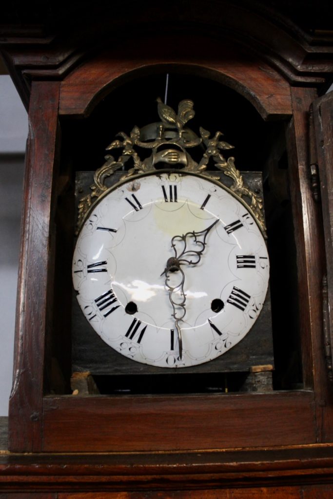 La partie haute est garnie d'une horloge avec un mouvement au coq, ainsi que deux petits compartiments de rangement sur les cotés.