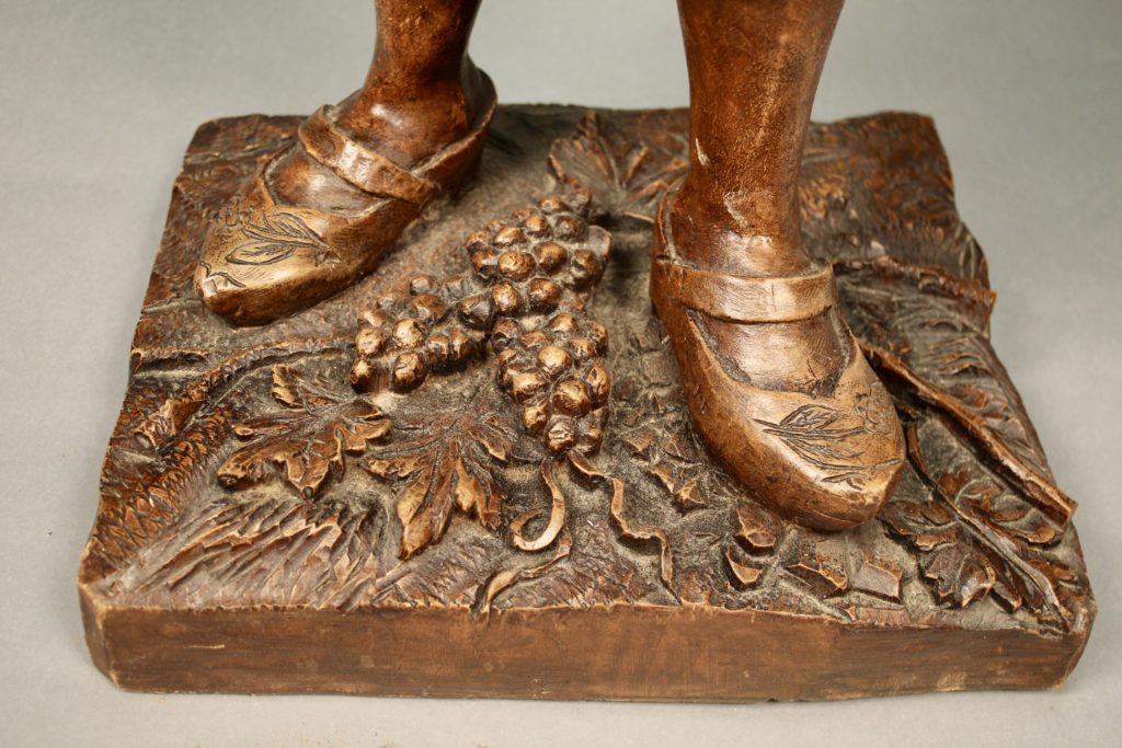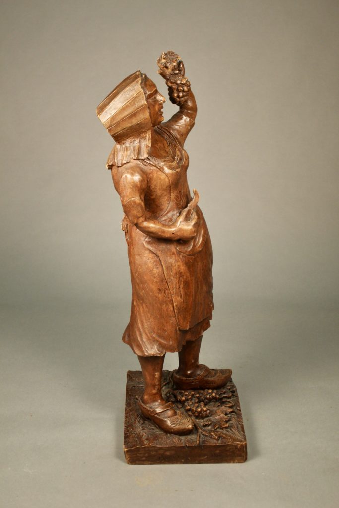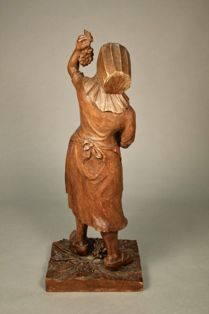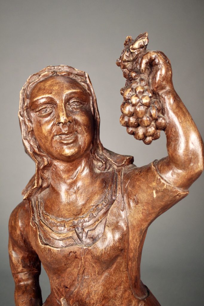 Sculpture en noyer représentant une vendangeuse, tenant une serpette dans sa main droite et une grappe de raisin dans sa main gauche.