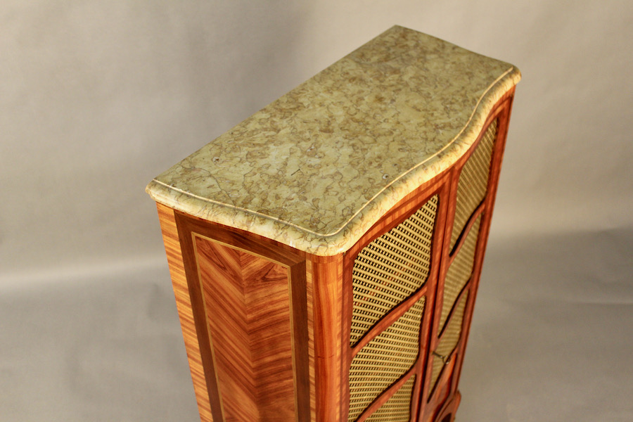 Dessus de marbre beige veiné mouluré à bec de corbin épousant la forme galbée de la bibliothèque.