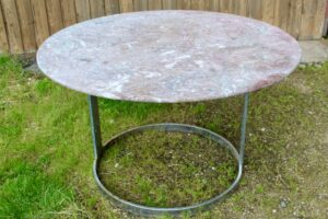 Paire de tables de bistrot à pietement ancien en fonte, et à plateau marbre veiné Breche de Saint ...